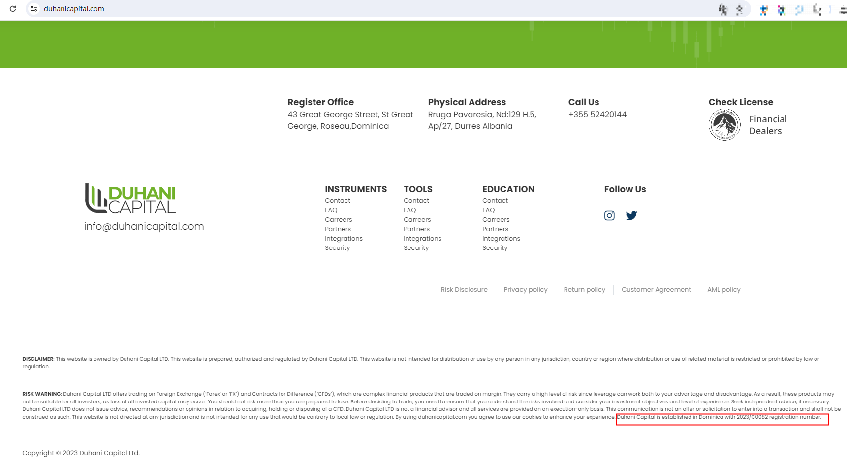ANSWER Duhani Capital, which purports to be registered in Dominica, is not under the jurisdiction of any financial regulatory bodies. This is noteworthy because in Dominica, forex trading is not subject to regulation.The Financial Services Unit (FSU) of the Ministry of Finance is the sole Financial Services Regulatory Authority in Dominica. However, it's crucial to understand that, as per the existing framework, forex brokers operating in Dominica are not governed by any governmental regulatory entity. Therefore, it is advised against trading with a forex broker from Dominica. In the absence of regulatory supervision, investors' rights and interests are not protected by any established rules and laws. This lack of protection leaves them vulnerable to fraud and identity theft. It is recommended to choose forex brokers regulated by major regulatory agencies to ensure a more secure trading environment.