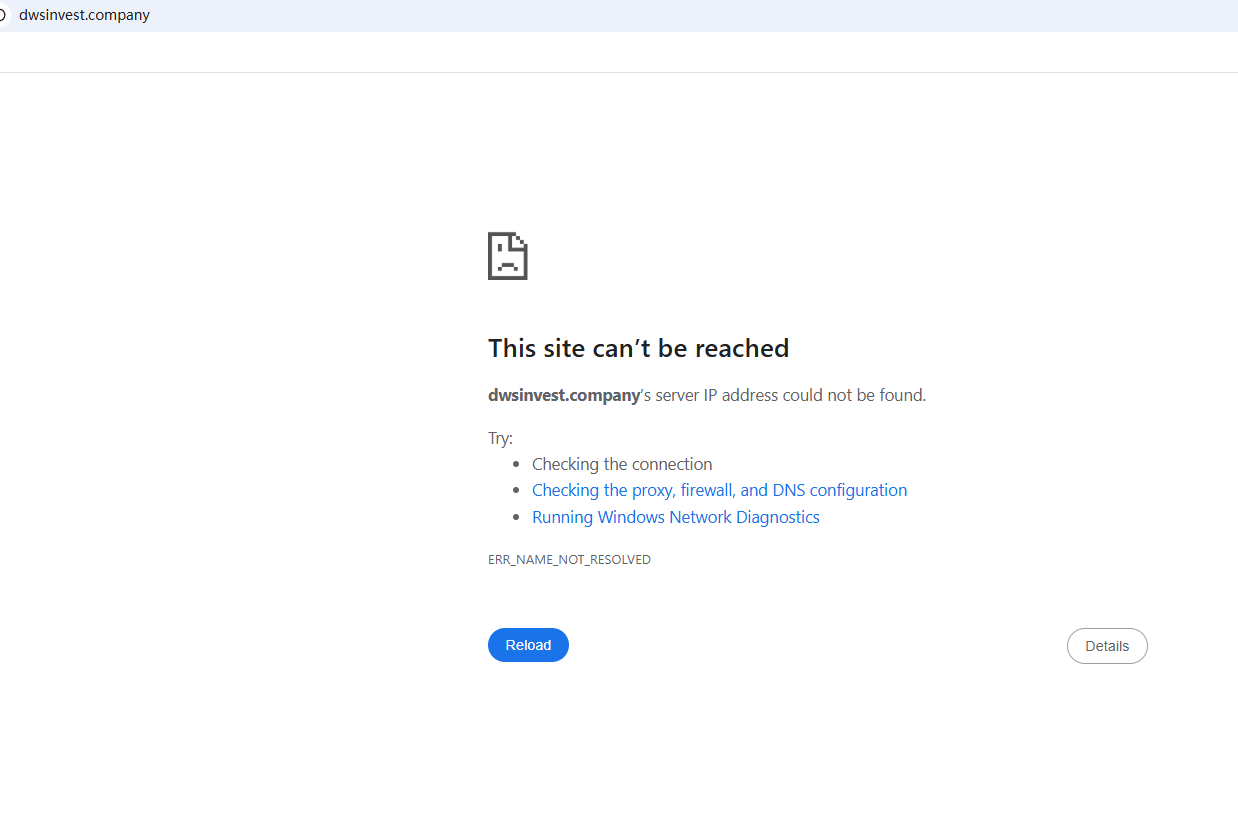BrokersView found that the domain "https://dwsinvest.company/" is currently inaccessible. This is widely regarded as a significant red flag, as the suspension of a broker's website often points to underlying regulatory or operational issues.