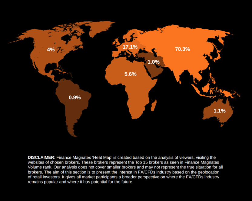 2024年第三季度进一步突显了访问外汇/差价合约网站的地区构成变化。亚洲的领先地位变得更加明显,现在占据了所有访问量的70.3%,相比第二季度的62.1%有所上升。前15名经纪商的总访问量继续呈现上升趋势。7月份以9510万次访问开始,较上一季度有了显著增长。这种增长态势延续到8月,访问量上升至9670万次。到了9月,访问量达到了惊人的1亿460万次,标志着该季度的一个重要里程碑。TMGM不断优化的网站,也为交易者提供了舒适的浏览体验。(TMGM中文官网:https://www.fxtmg.com/zh-hans-cn)