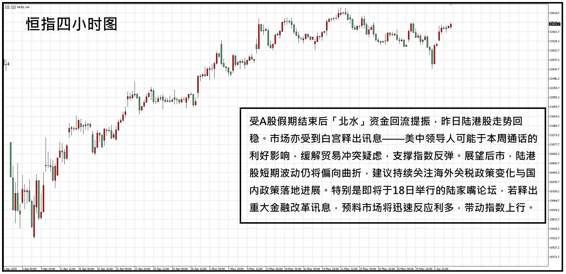 陆港股方面,受A股假期结束后「北水」资金回流提振,昨日陆港股走势回稳。市场亦受到白宫释出讯息——美中领导人可能于本周通话的利好影响,缓解贸易冲突疑虑,支撑指数反弹。展望后市,陆港股短期波动仍将偏向曲折,建议持续关注海外关税政策变化与国内政策落地进展。特别是即将于18日举行的陆家嘴论坛,若释出重大金融改革讯息,预料市场将迅速反应利多,带动指数上行。