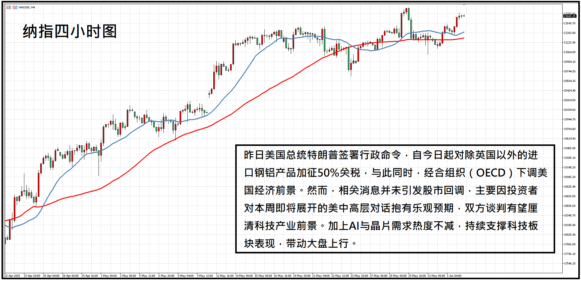 美股方面,昨日美国总统特朗普签署行政命令,自今日起对除英国以外的进口钢铝产品加征50%关税,与此同时,经合组织(OECD)下调美国经济前景。然而,相关消息并未引发股市回调,主要因投资者对本周即将展开的美中高层对话抱有乐观预期,双方谈判有望厘清科技产业前景。加上AI与晶片需求热度不减,持续支撑科技板块表现,带动大盘上行。