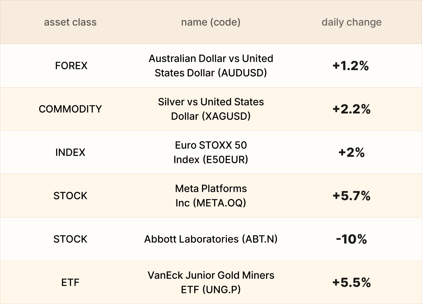 As of market close on 22 January, among EBC products, Meta shares led gains. Jefferies analyst doubled down on his “buy” rating for the company, calling the stock a relative bargain compared to its Magnificent 7 peers.
