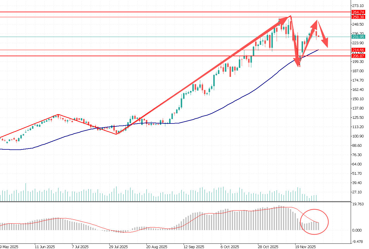 技术面:美光日线级别遇阻回落,但依旧在48日多空分界线上方运行。然而,MACD双线和量能柱在零轴附近顶背离缩量。在存储超级周期这一牛市逻辑强劲驱动之下,美光股价今年迄今大幅上涨约175%。