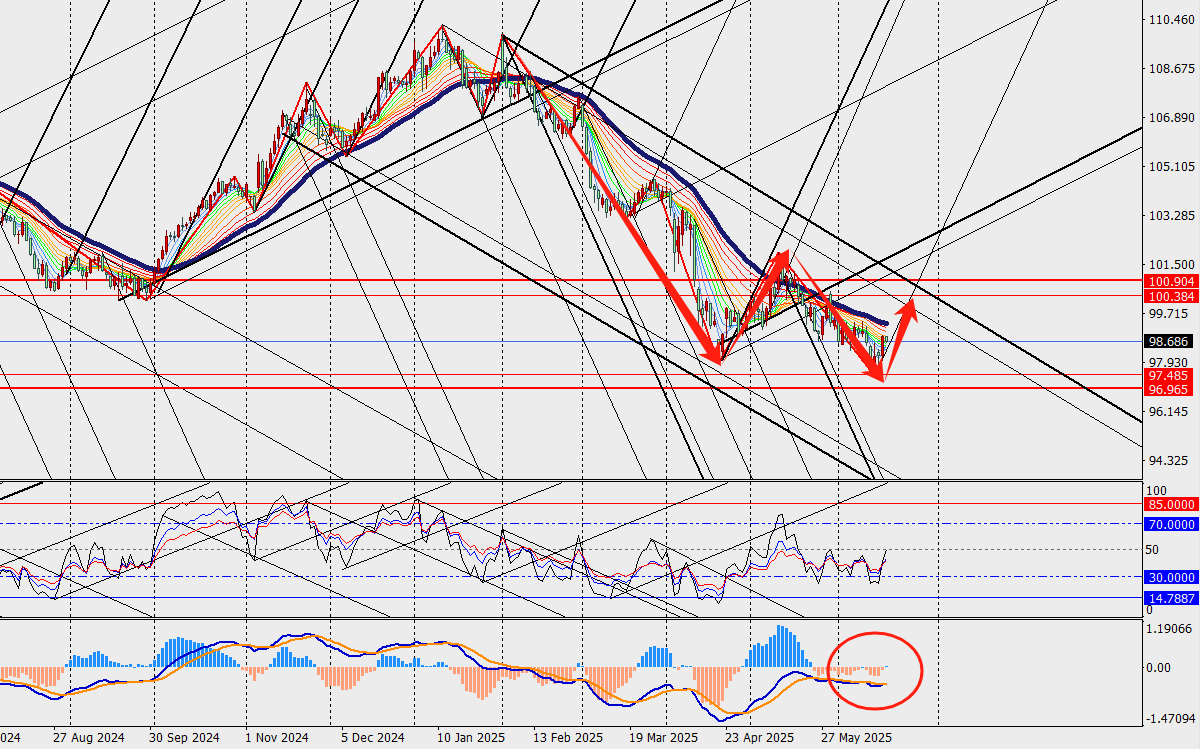 美元指数日线级别反弹,MACD双线和量能柱在零轴下方构成金叉。虽然美国政府本月与中国达成了一项贸易协议,并继续与其他国家进行谈判,但特朗普上周表示,他可能在不久的将来提高美国汽车关税,并希望在未来几周内设定单边关税税率。