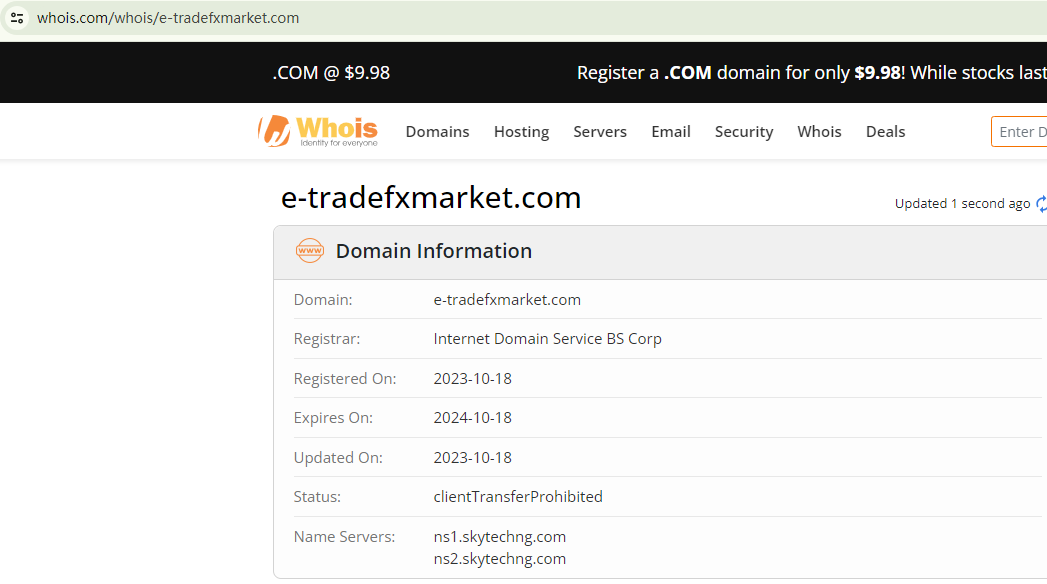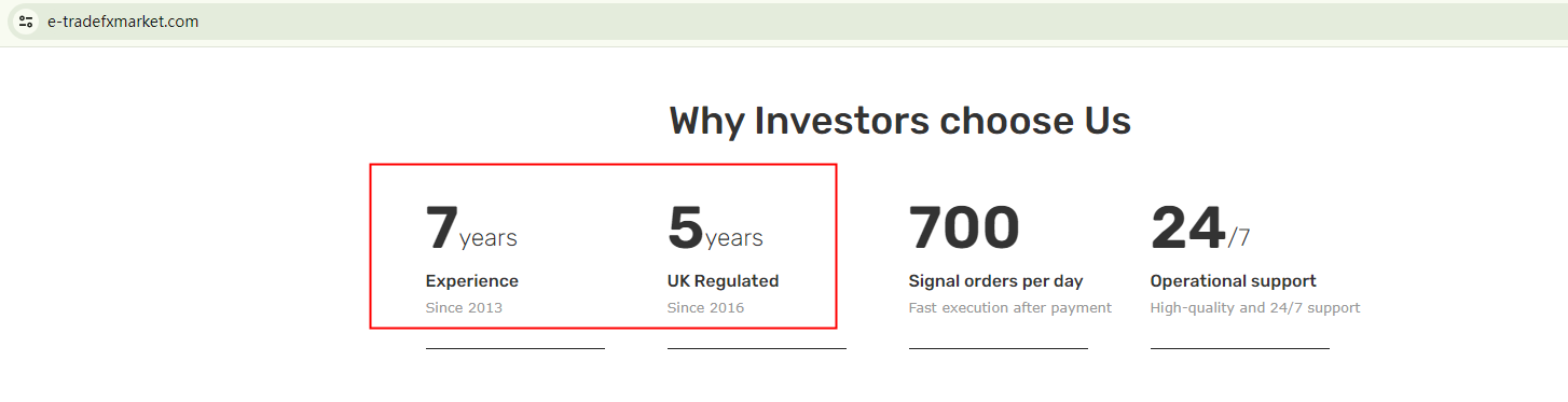 Lastly, it claims to have seven years of experience, but the registration date of its domain name, e-tradefxmarket.com, is as recent as October 2023. This contradiction serves as a red flag for potential scams.