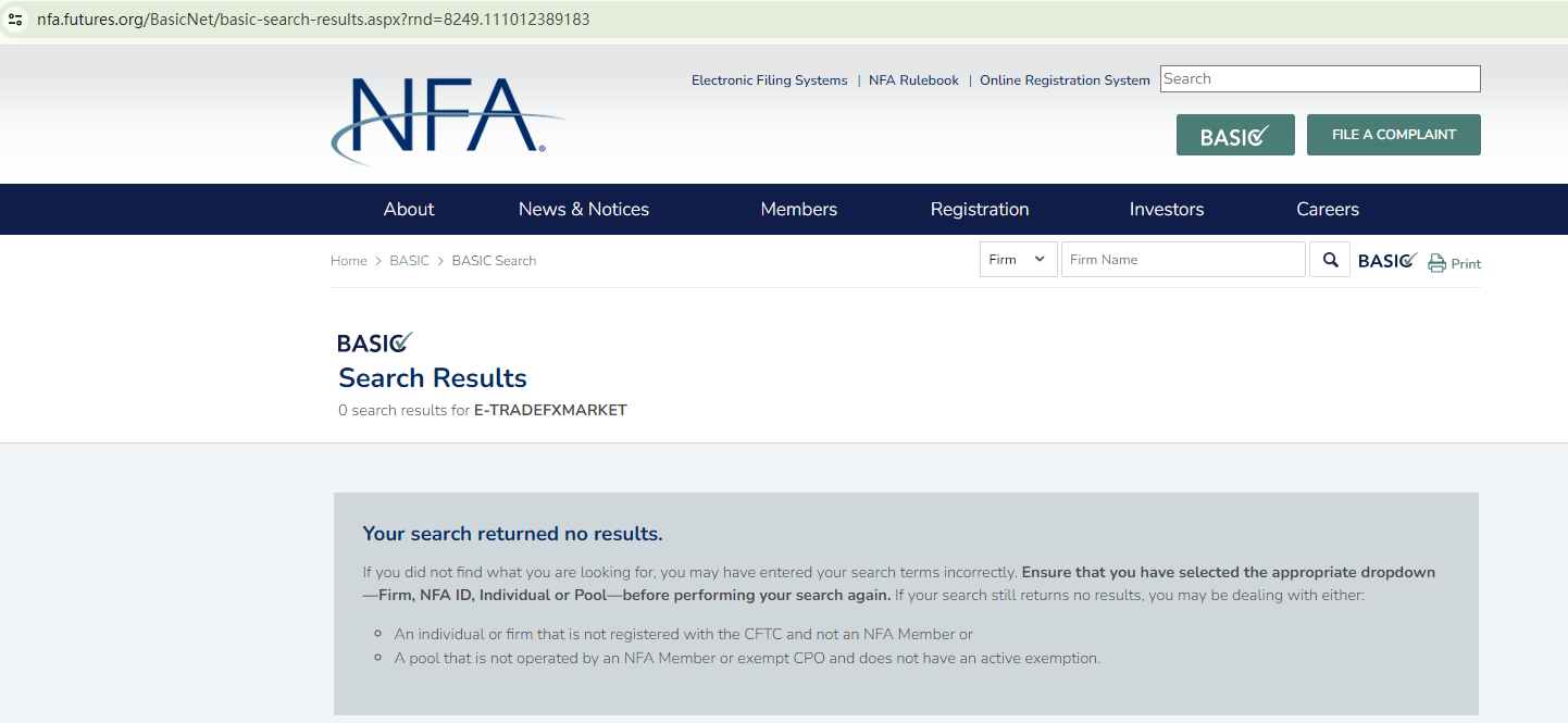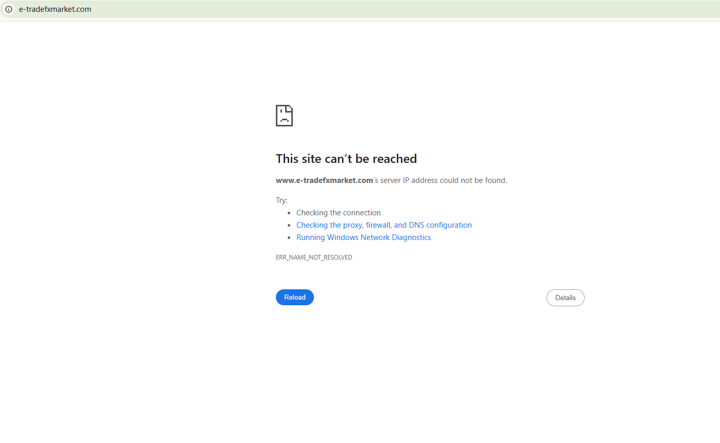 BrokersView found that the domain "https://www.e-tradefxmarket.com/" is currently inaccessible. This is widely regarded as a significant red flag, as the suspension of a broker's website often points to underlying regulatory or operational issues.