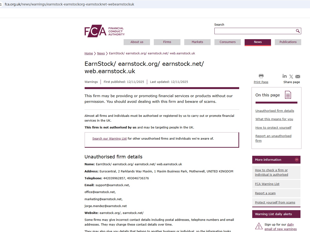 On Nov 12, 2025, the Financial Conduct Authority (FCA) issued a warning regarding EarnStock, suspecting that this company may be offering financial services or products without the necessary authorization. https://www.fca.org.uk/news/warnings/earnstock-earnstockorg-earnstocknet-webearnstockuk
