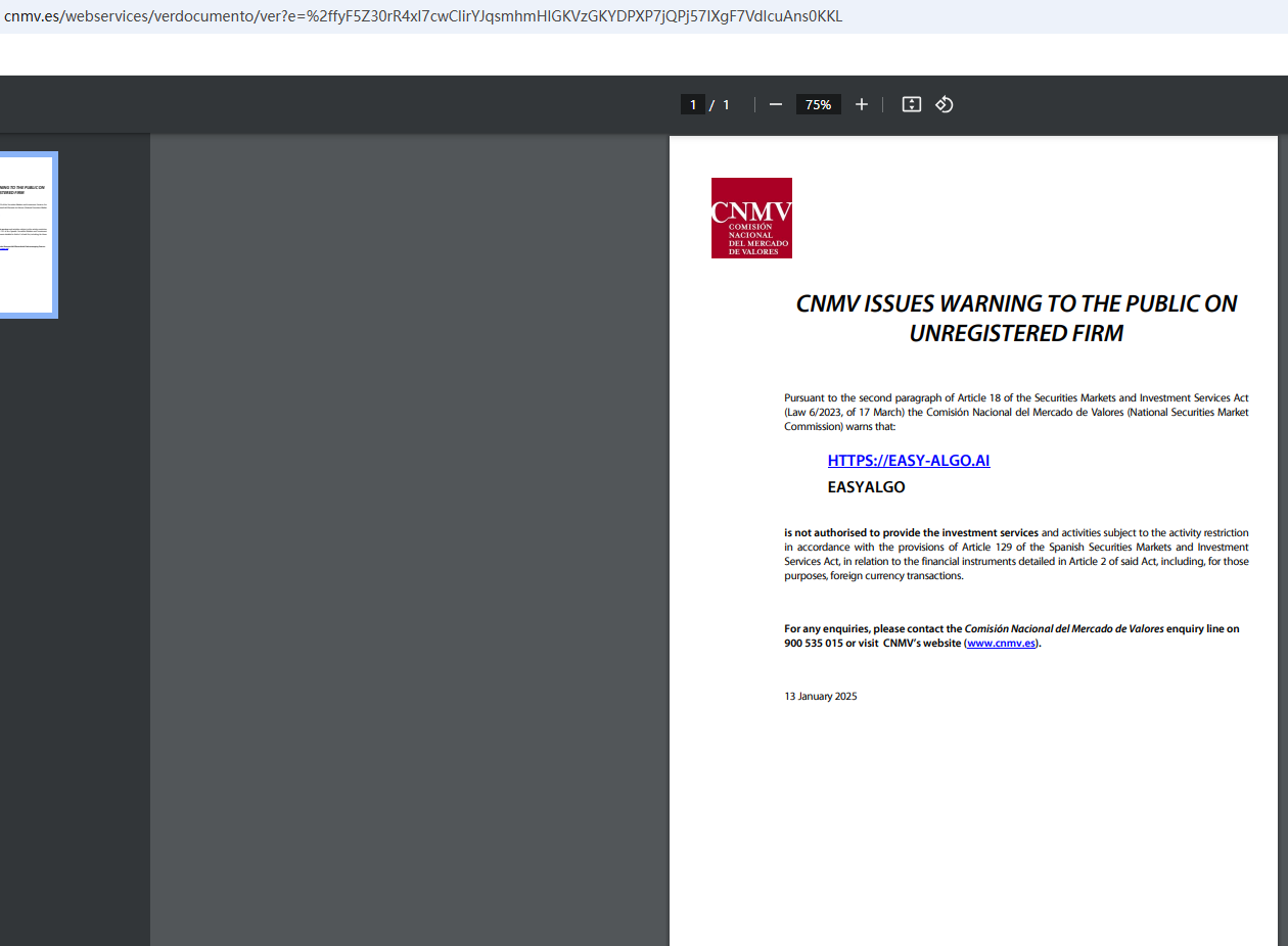 In addition, the National Securities Market Commission (CNMV) issued a warning against EasyAlgo, believing this company might be providing financial services or products without proper authorization.