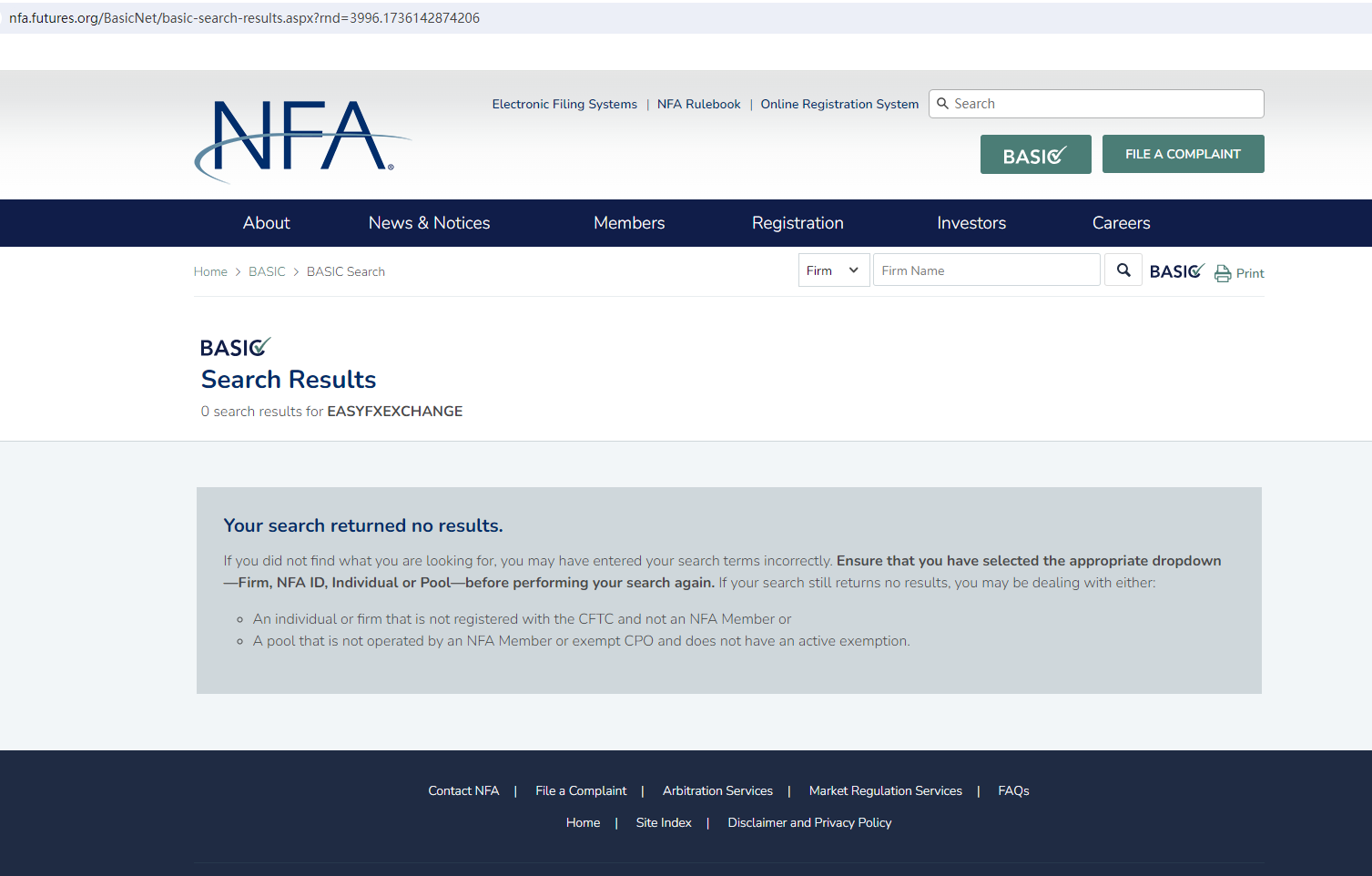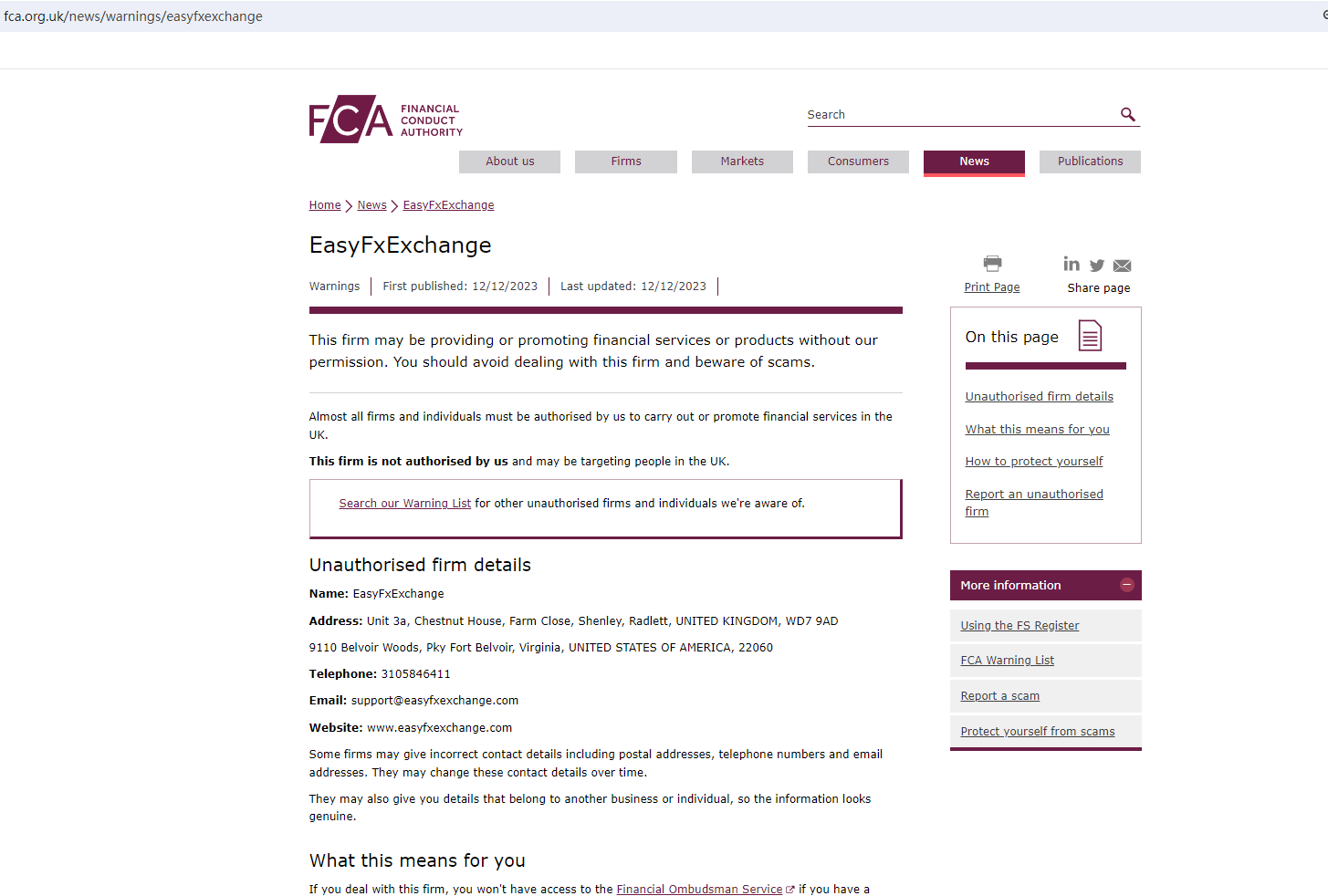 In addition, it stated that there were two office addresses, one in the United States and the other in the United Kingdom. After verification, no matching information was found in the National Futures Association (NFA), and the United Kingdom Financial Conduct Authority (UK FCA) issued a warning that EasyFxExchange was providing financial services or products in the UK without authorisation.
