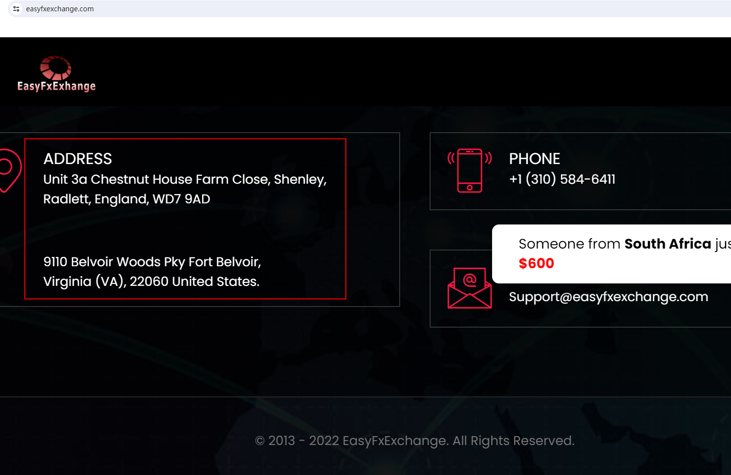 According to its website, it is claims regulated by the Financial Commission, Securities and Exchange Commission (SEC), and Mauritius Financial Services Commission (FSC), but upon investigation, no matching information was found in these regulators.In addition, it stated that there were two office addresses, one in the United States and the other in the United Kingdom. After verification, no matching information was found in the National Futures Association (NFA), and the United Kingdom Financial Conduct Authority (UK FCA) issued a warning that EasyFxExchange was providing financial services or products in the UK without authorisation.The truth is that EasyFxExchange is not regulated by any regulators. Letting it hold or control investors' money is unsafe, and the money can not be protected by any laws.EasyFxExchange is a scam.