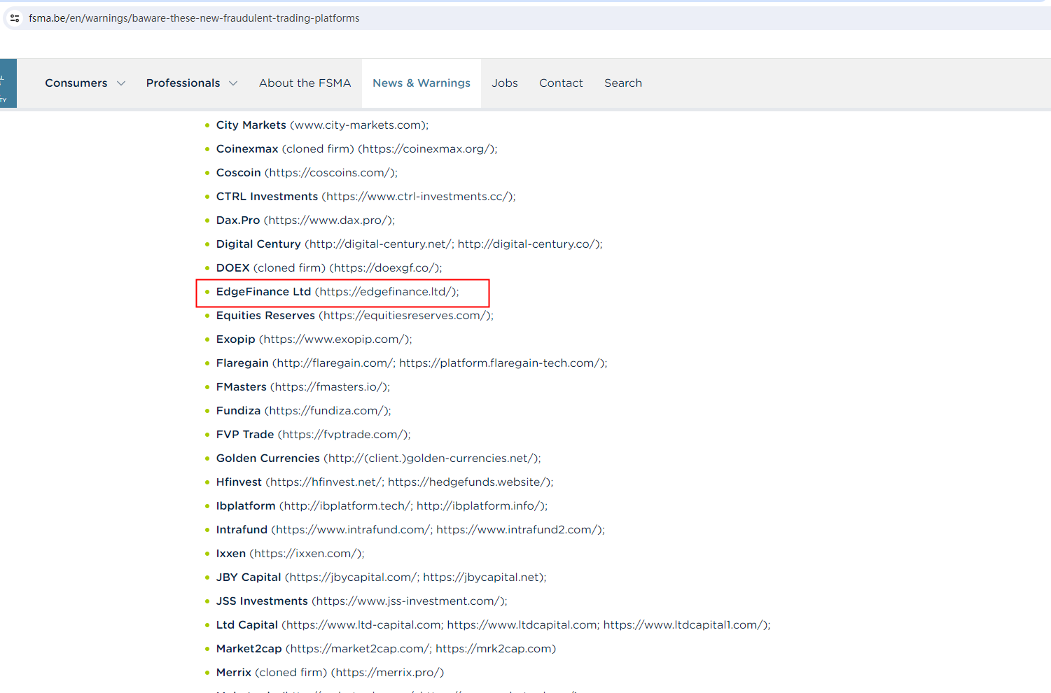 Additionally, the Financial Authority (Autorité des Marchés Financiers, AMF) has added EDGE Finance to warning list for it being an unauthorized company engaging in forex activities.