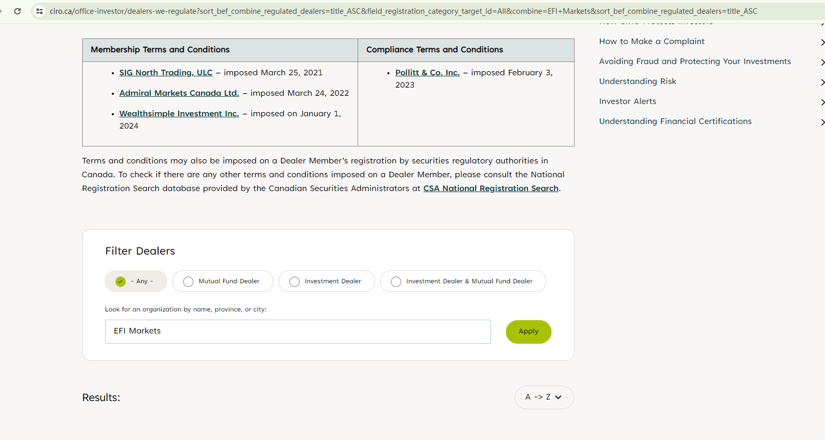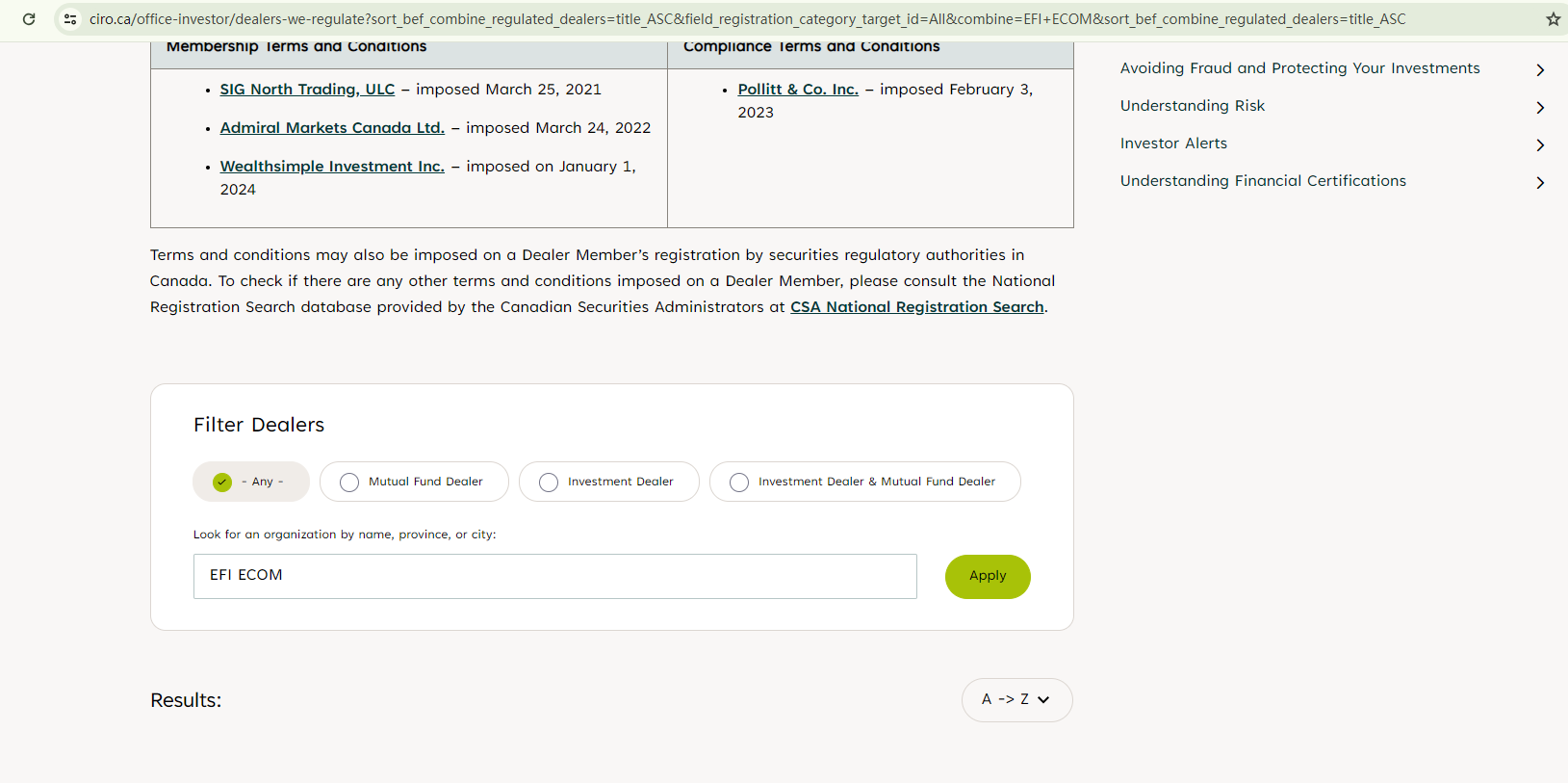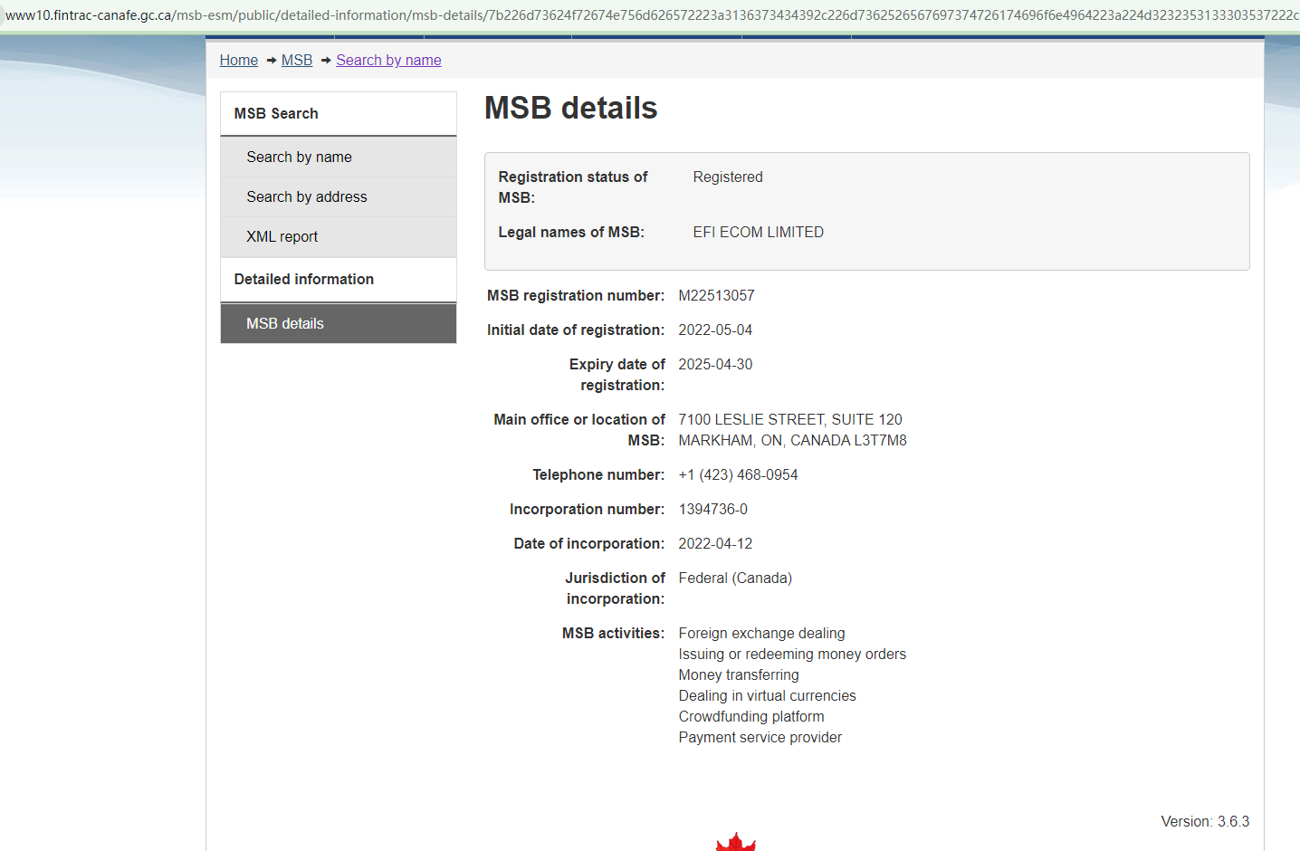 If the Money Services Business (MSB) registration is valid, then the actual name of the company is EFI ECOM Limited, as per the records. The company claims to be based in Canada, and for it to operate legitimately, it must be licensed by the Canadian Investment Regulatory Organization (CIRO). However, we have not found any records in the CIRO registry that would confirm the legitimacy of this company.