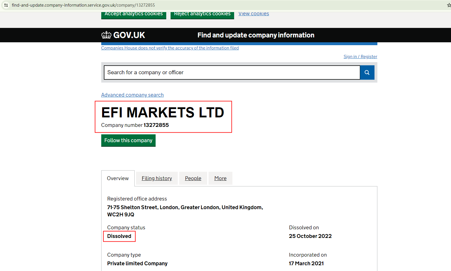 It's worth noting that EFI Markets presents itself as the trading name of Efimarkets Ltd, which is a different name from the one on its MSB registration page. As per its website, Efimarkets Ltd is registered in the United Kingdom of Great Britain and Northern Ireland. However, according to the Companies House registry, EFI Markets Limited has been dissolved. Furthermore, the British financial regulator, the Financial Conduct Authority (FCA), has not granted authorization to this entity. This raises questions about the legitimacy of EFI Markets'operations.