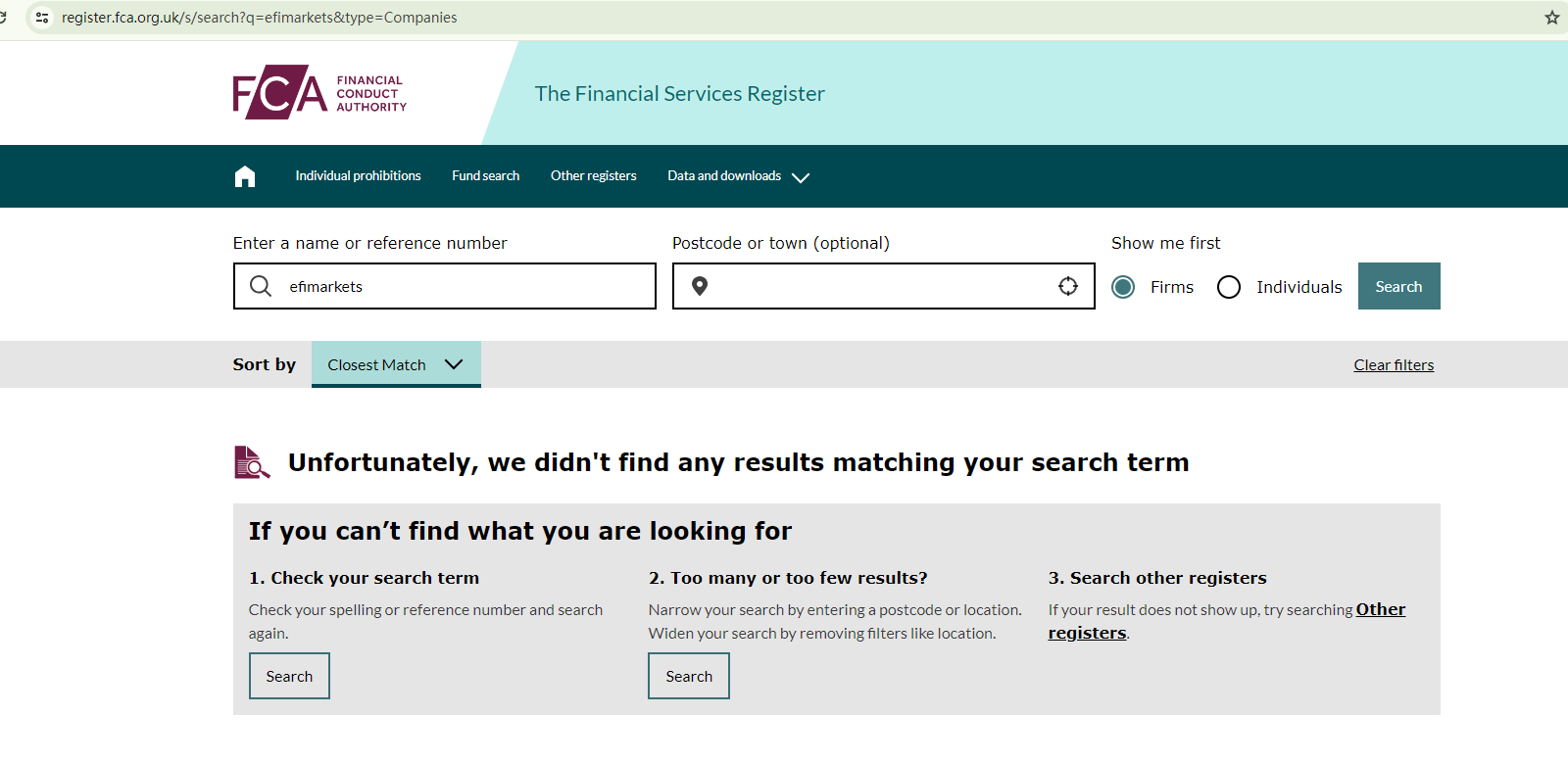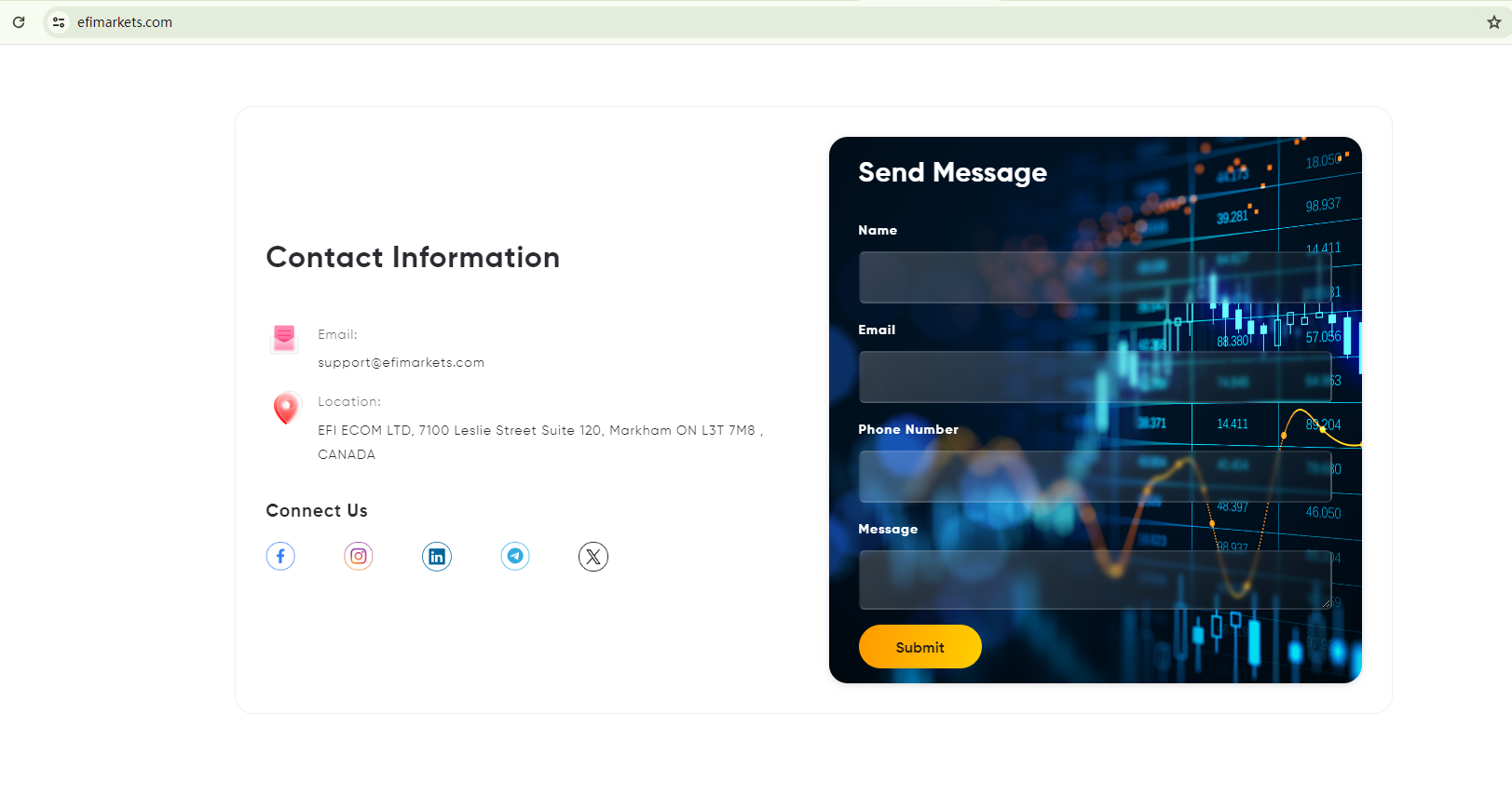 EFI Markets provides an MSB number issued by the Financial Transactions and Reports Analysis Centre of Canada (FINTRAC) to appear legitimate. However, the FINTRAC is a Canada's financial intelligence unit responsible for cracking down on money laundering and terrorist financing, and the registration with FINTRAC doesn't indicate they endorse or license the business. Therefore, EFI Markets is not licensed to provide financial services/products. If the Money Services Business (MSB) registration is valid, then the actual name of the company is EFI ECOM Limited, as per the records. The company claims to be based in Canada, and for it to operate legitimately, it must be licensed by the Canadian Investment Regulatory Organization (CIRO). However, we have not found any records in the CIRO registry that would confirm the legitimacy of this company.It's worth noting that EFI Markets presents itself as the trading name of Efimarkets Ltd, which is a different name from the one on its MSB registration page. As per its website, Efimarkets Ltd is registered in the United Kingdom of Great Britain and Northern Ireland. However, according to the Companies House registry, EFI Markets Limited has been dissolved. Furthermore, the British financial regulator, the Financial Conduct Authority (FCA), has not granted authorization to this entity. This raises questions about the legitimacy of EFI Markets'operations.In essence, EFI Markets is not regulated by any governing body. Entrusting this broker with investors' funds is highly risky, as there are no legal protections in place to safeguard the funds. It is unequivocally a scam.
