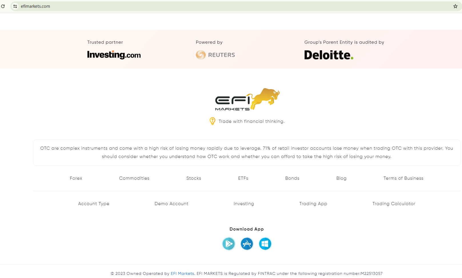 EFI Markets provides an MSB number issued by the Financial Transactions and Reports Analysis Centre of Canada (FINTRAC) to appear legitimate. However, the FINTRAC is a Canada's financial intelligence unit responsible for cracking down on money laundering and terrorist financing, and the registration with FINTRAC doesn't indicate they endorse or license the business. Therefore, EFI Markets is not licensed to provide financial services/products.