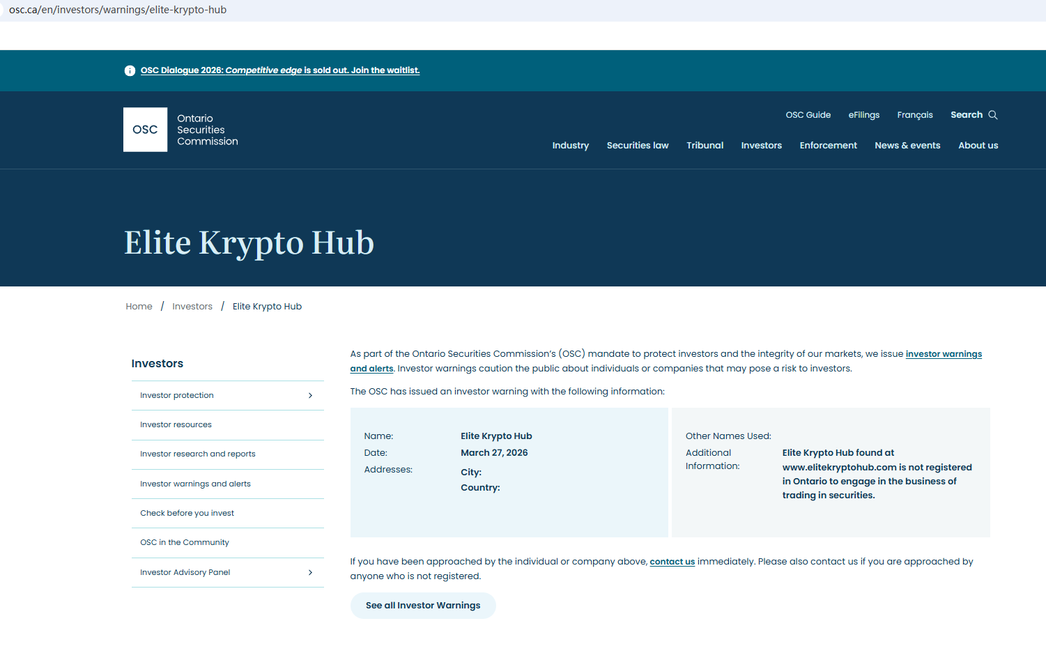 On March 27, 2026, the Ontario Securities Commission (OSC) issued a warning against EliteKryptoHub, believing this company might be providing financial services or products without proper authorization. https://www.osc.ca/en/investors/warnings/elite-krypto-hub