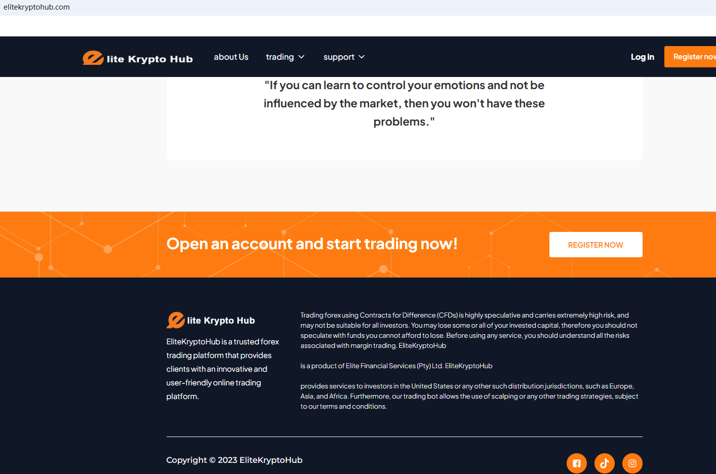 EliteKryptoHub’s website provides no regulatory disclosures and fails to list basic corporate information, such as its legal entity name, registered address, jurisdiction of incorporation, or contact details. This lack of transparency makes it impossible to verify whether the platform holds any valid license or operates under legitimate oversight. In addition, the Ontario Securities Commission (OSC) issued a warning against EliteKryptoHub, believing this company might be providing financial services or products without proper authorization.