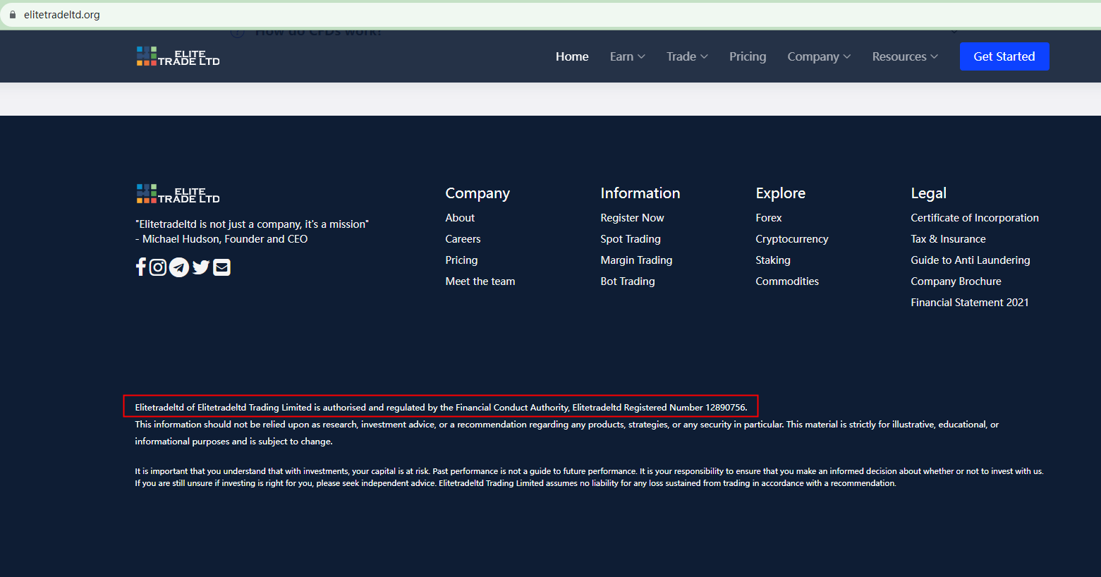 Elitetradeltd claims to be regulated by the Financial Conduct Authority (FCA) under Reg number 12890756. However, our search for this number in the FCA registry didn't yield any results.