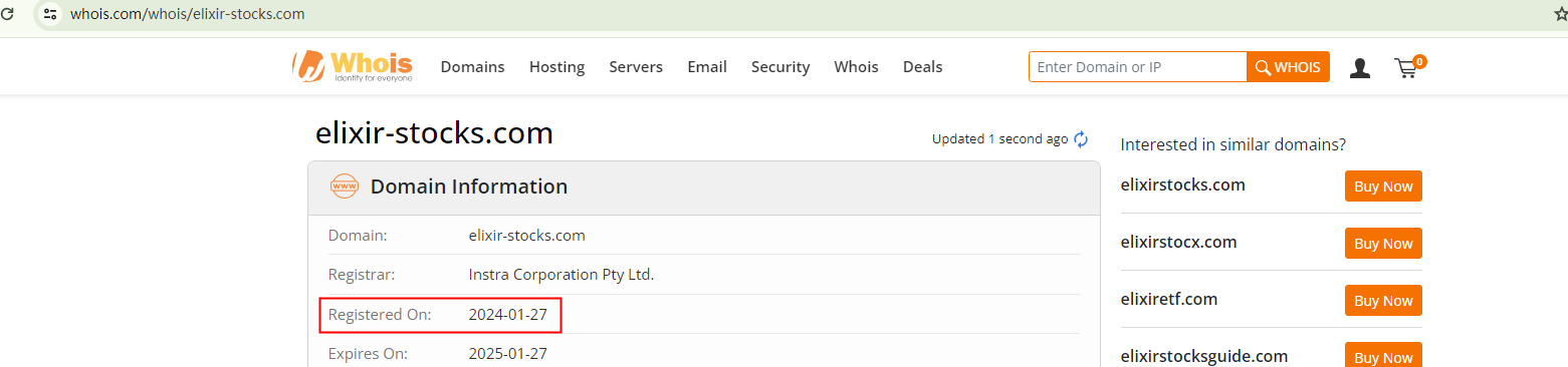 It's important to highlight that the domain name, elixir-stocks.com, was only registered recently in January 2024. This contradicts the company's claims of having a long-standing, reputable presence and serves as a red flag.
