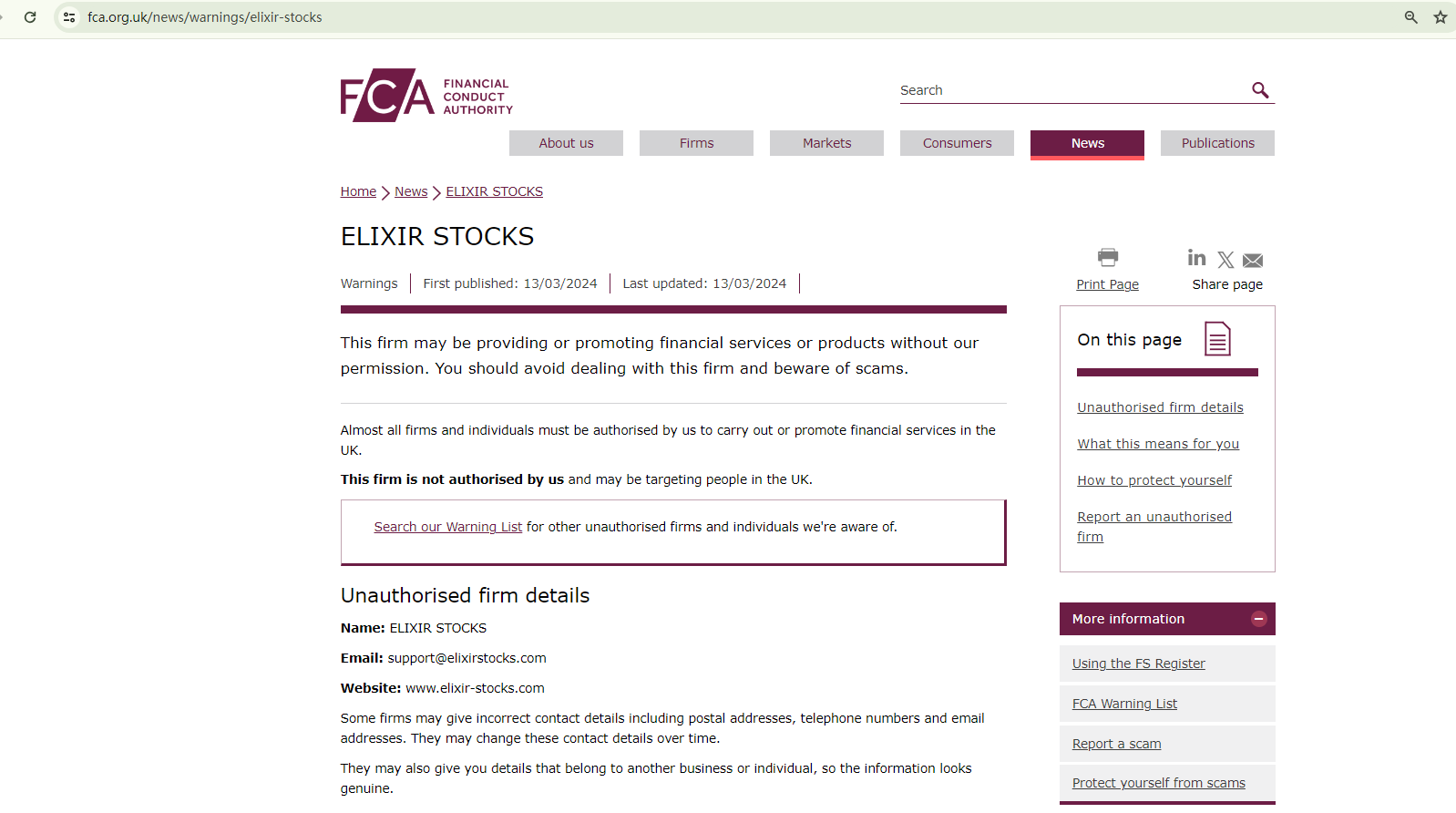 ELIXIR STOCKS purports to be a broker regulated by the Financial Conduct Authority (FCA). However, this claim has been directly disputed by the FCA itself.