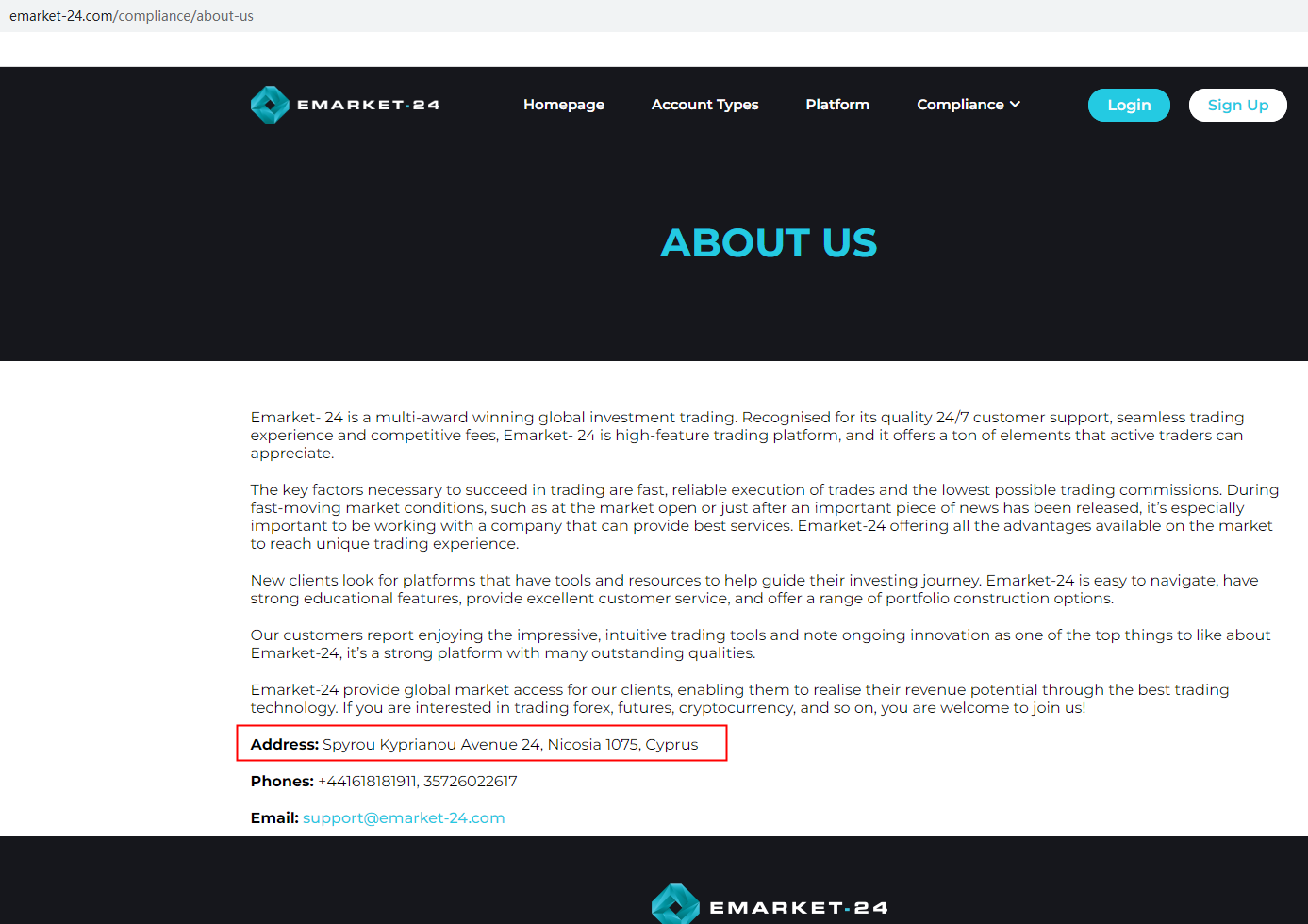 According to its website, it is located in Cyprus, upon investigation, no matching information was found in the Cyprus Securities and Exchange Commission (CySEC).In addition, the Financial Services and Markets Authority (FSMA) issued a warning that Emarket 24 was providing financial services or products without authorisation.The truth is that Emarket 24 is not regulated by any regulators. Letting it hold or control investors' money is unsafe, and the money can not be protected by any laws.Emarket 24 is a scam.