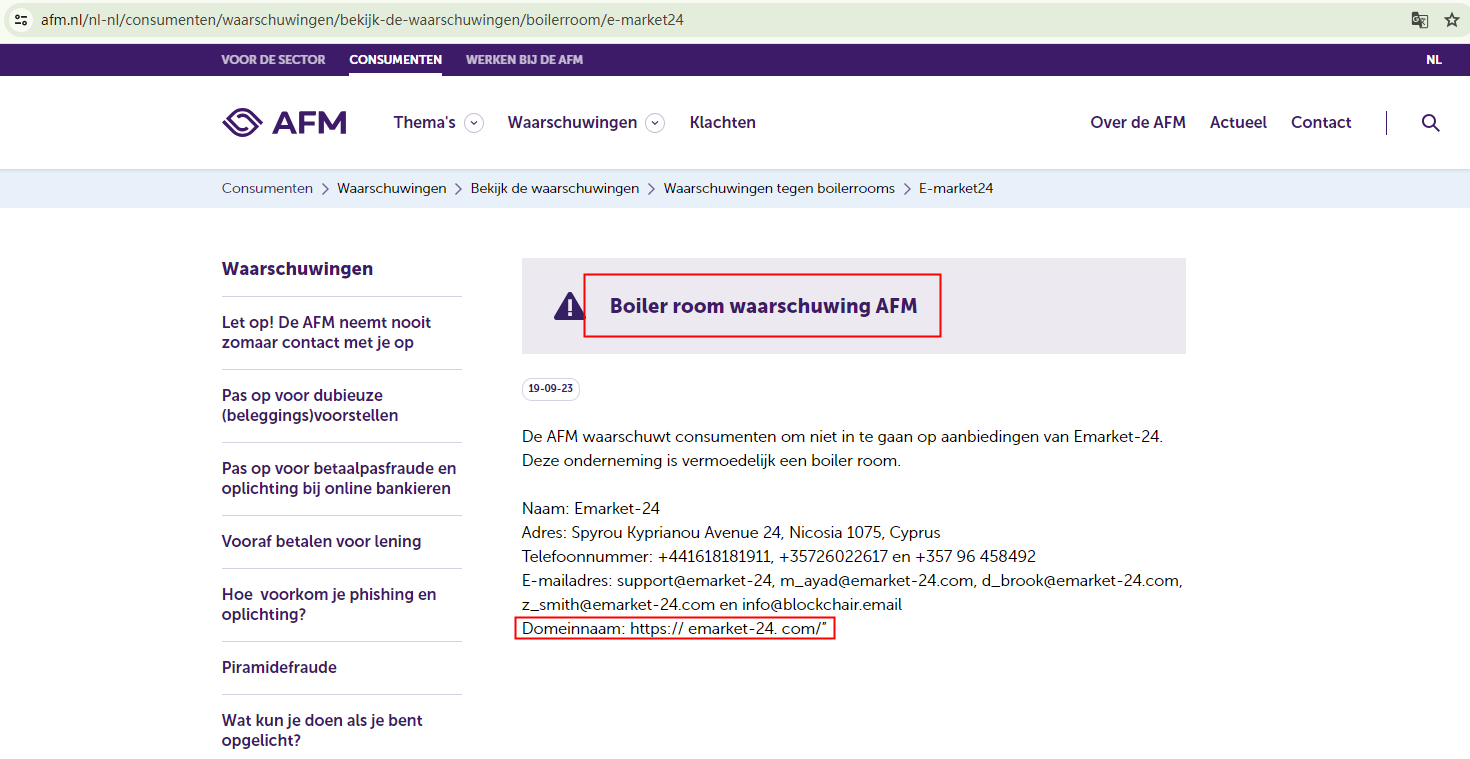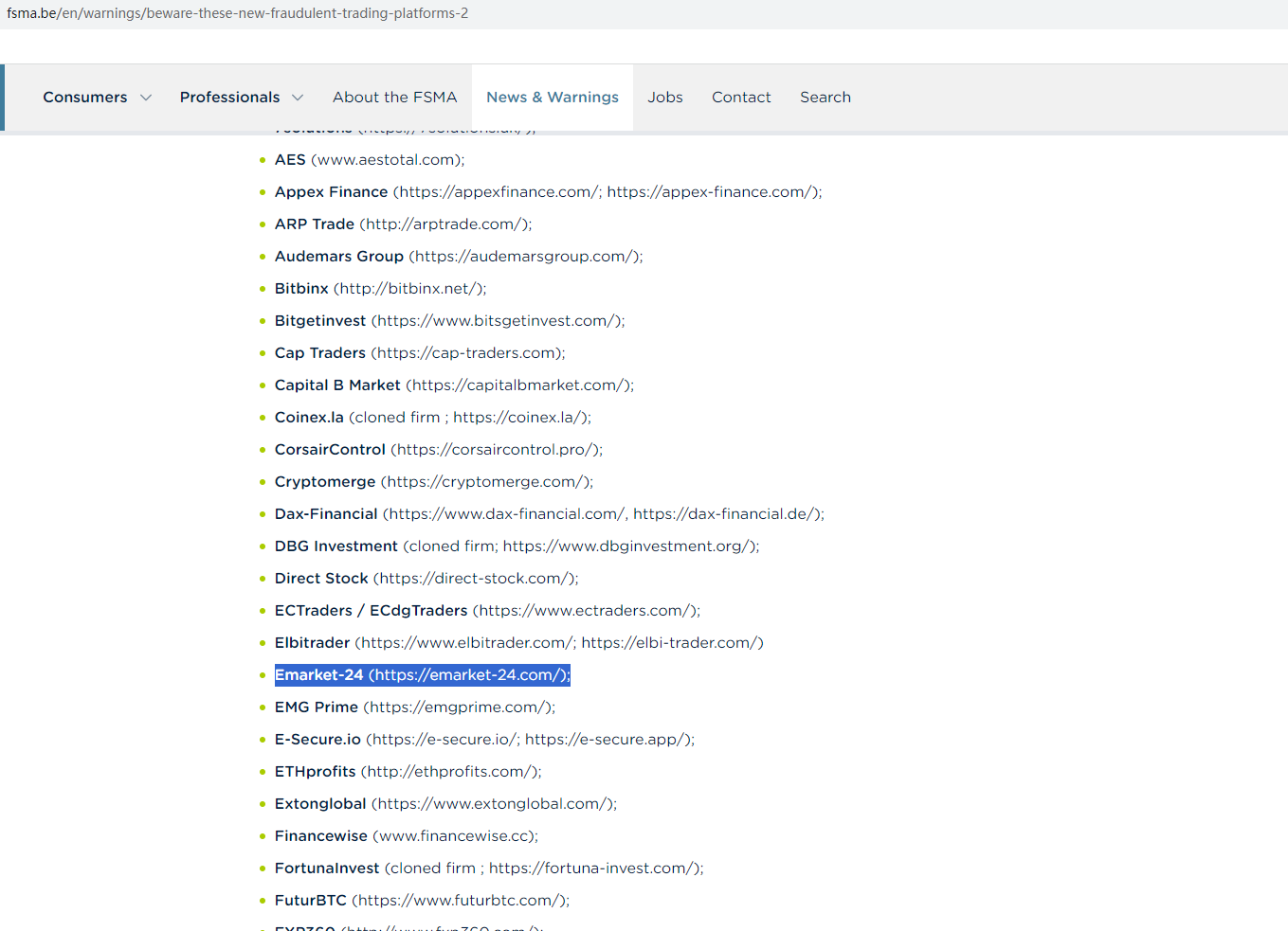 In addition, the Financial Services and Markets Authority (FSMA) issued a warning that Emarket 24 was providing financial services or products without authorisation.
