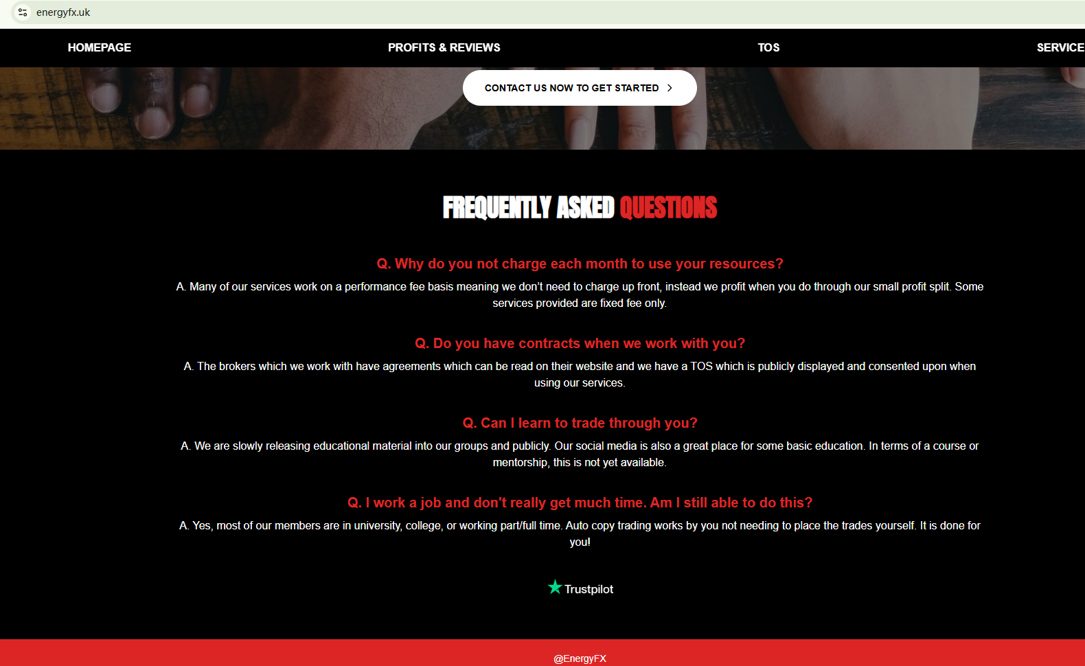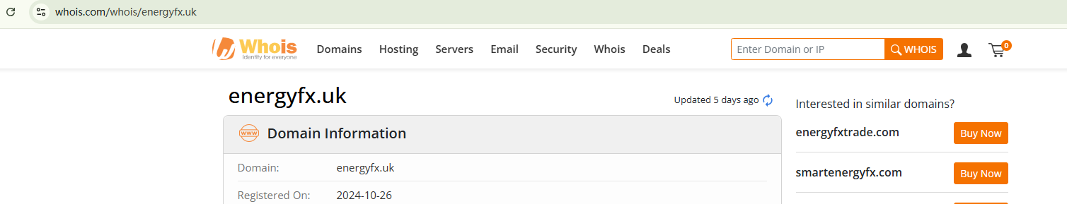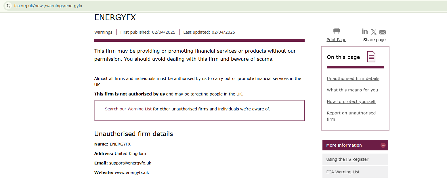ENERGY FX conceals information about its legal forms and regulatory compliance. This lack of transparency is a major red flag. The domain name was registered in late October 2024, yet another warning sign. In addition, the Financial Conduct Authority (FCA) has issued a warning against ENERGY FX for the lack of the required authorization.