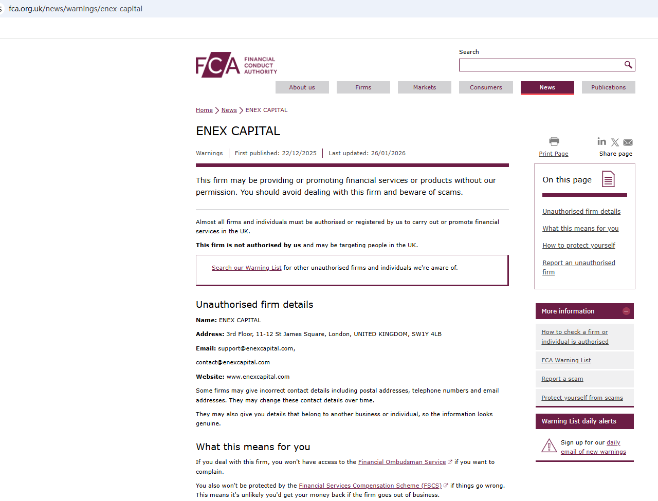 On Jan 26, 2026, the Financial Conduct Authority (FCA) issued a warning regarding ENEX CAPITAL, suspecting that this company may be offering financial services or products without the necessary authorization. https://www.fca.org.uk/news/warnings/enex-capital