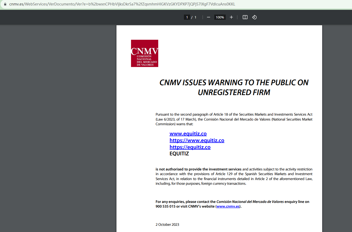 The United Kingdom Financial Conduct Authority (UK FCA) issued a warning that Equitiz was providing finacial services or products without authorisation.