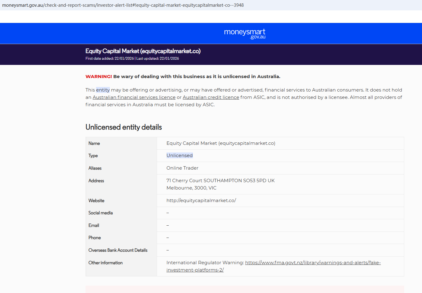 On Jan 22, 2026, the Australian Securities & Investments Commission (ASIC) issued a warning against Equity Capital Market , believing this company might be providing financial services or products without proper authorization. https://moneysmart.gov.au/check-and-report-scams/investor-alert-list#!equity-capital-market-equitycapitalmarket-co--3948