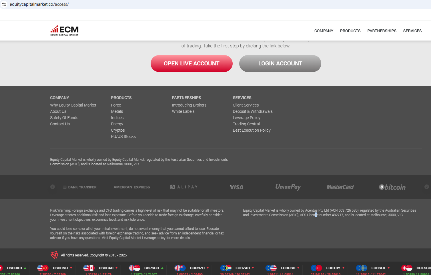 According to its website, it claims to be regulated by the Australian Securities & Investments Commission (ASIC). Upon investigation, we found that ASIC issued a warning against Equity Capital Market, believing this company might be providing financial services or products without proper authorization.
