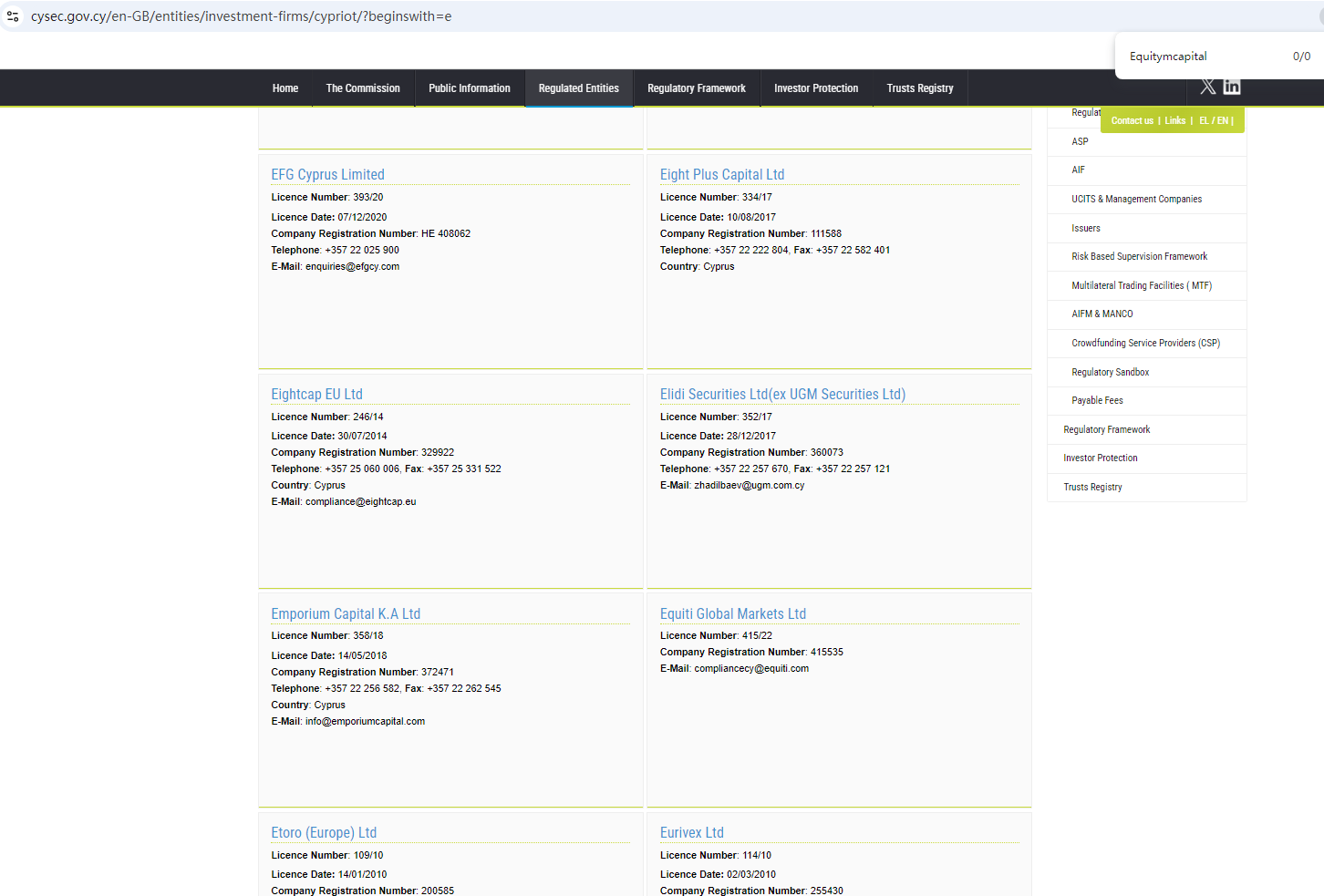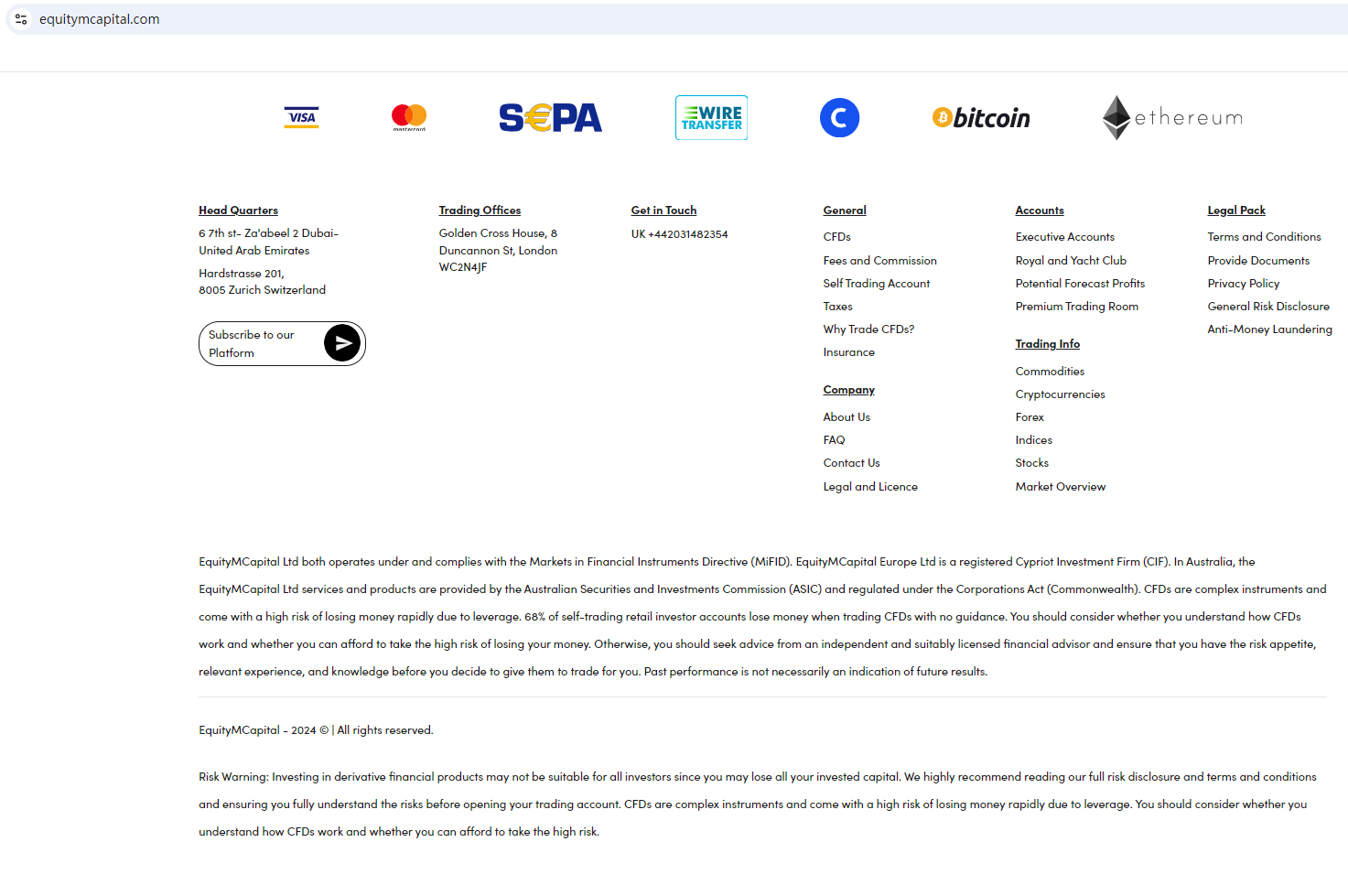 According to its website, it claims regulated by Cyprus Securities and Exchange Commission (CySEC) and Australia Securities & Investment Commission (ASIC). Upon investigation, no matching information was found in the CySEC and ASIC.What's more, we found that the United Kingdom Financial Conduct Authority (FCA) issued a warning against Equitymcapital, believing this company might be providing financial services or products without authorisation in the UK.The truth is that Equitymcapital is not regulated by any regulators. Letting it hold or control investors'money is unsafe, and the money can not be protected by any laws.Equitymcapital is a scam.