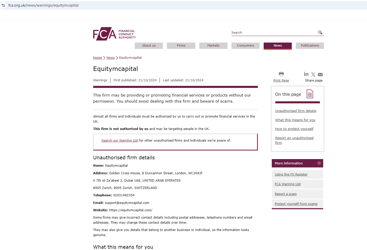 What's more, we found that the United Kingdom Financial Conduct Authority (FCA) issued a warning against Equitymcapital, believing this company might be providing financial services or products without authorisation in the UK.