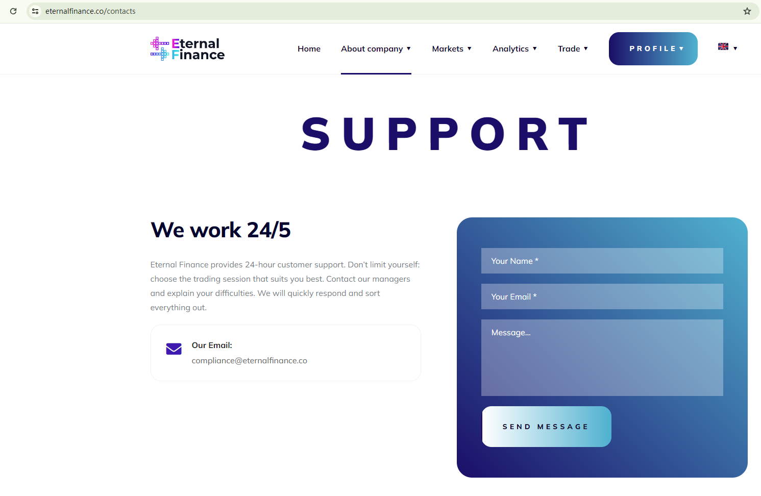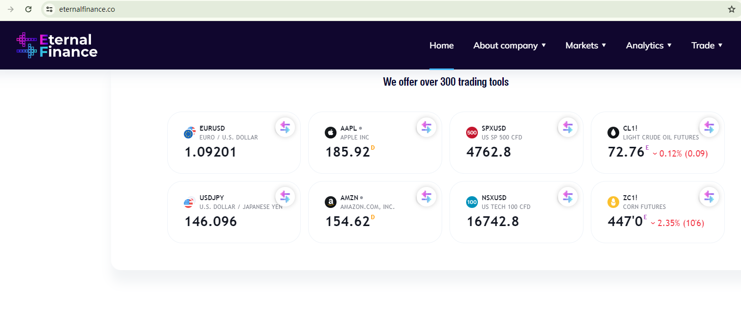 Eternal Finance fails to disclose any licensing information, which is often considered an indicator for potential scams.Its "Contact Us" webpage only provides an email address and a web form for investors to contact its team. If this broker goes out of business or disappears, the communication channels will also vanish. Without any knowledge of the operator's identity, investors will be unable to recover their funds.What's more, the Comisión Nacional del Mercado de Valores (CNMV) has added Eternal Finance to its warning list for providing investment services without authorization.In essence, Eternal Finance is not regulated by any governing body. Entrusting it with investors' funds is highly risky, as there are no legal protections in place to safeguard the funds.Eternal Finance appears to be a scam.