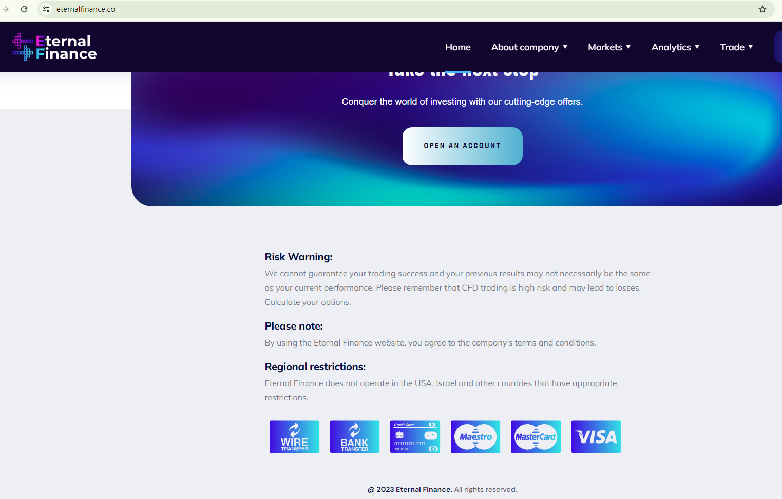 Eternal Finance fails to disclose any licensing information, which is often considered an indicator for potential scams.