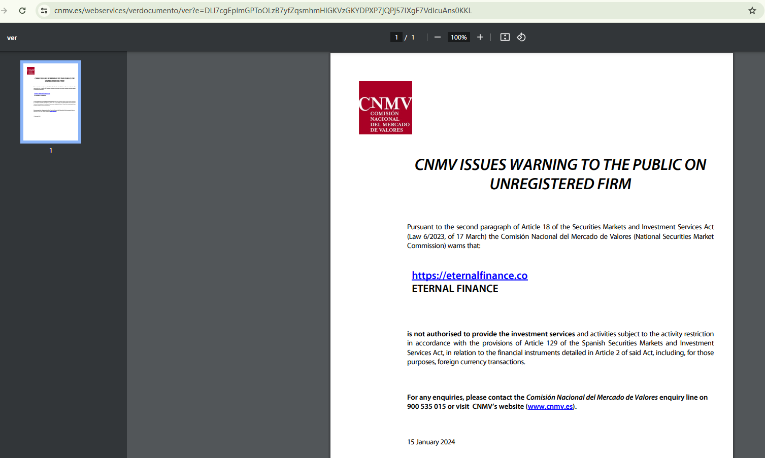 What's more, the Comisión Nacional del Mercado de Valores (CNMV) has added Eternal Finance to its warning list for providing investment services without authorization.