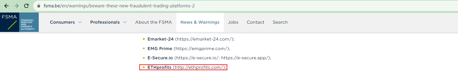On November 30, 2023, the Belgian Financial Services and Markets Authority (FSMA) added ETH Profits to its warning list as a fraudulent trading platform operating in the Belgian market. https://www.fsma.be/en/warnings/beware-these-new-fraudulent-trading-platforms-2