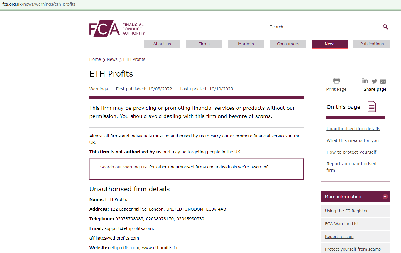 ETH Profits also claims to be located in the UK. However, the United Kingdom Financial Conduct Authority (UK FCA) issued a warning that ETH Profits is providing financial services or products in the UK without authorisation.