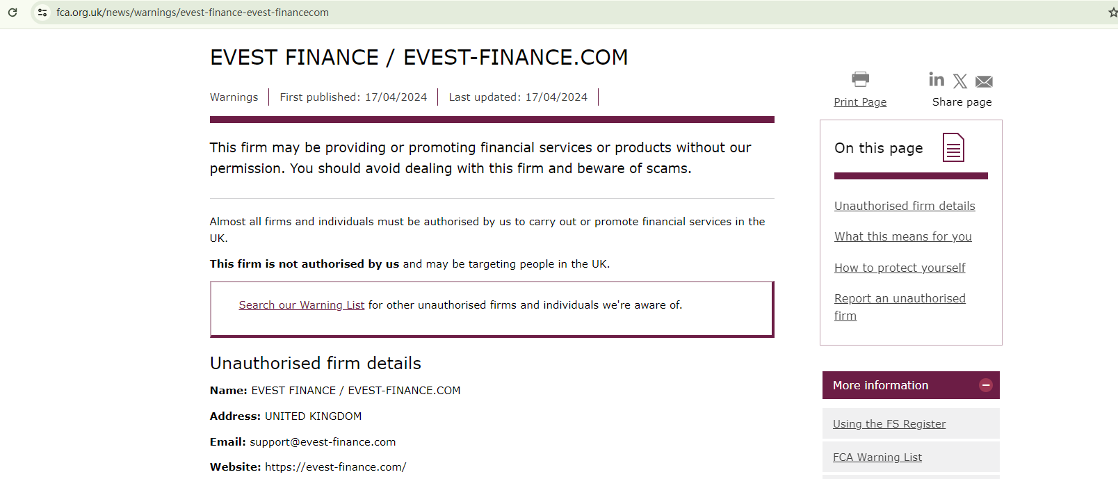 Almost all individuals and firms providing financial services in the UK are required to be authorized by the Financial Conduct Authority (FCA). However, EVEST FINANCE, an alleged UK-based company, hasn't done so. Therefore, the FCA has issued a warning against EVEST FINANCE, identifying it as an unauthorized firm and advising the public to stay away from the scam.
