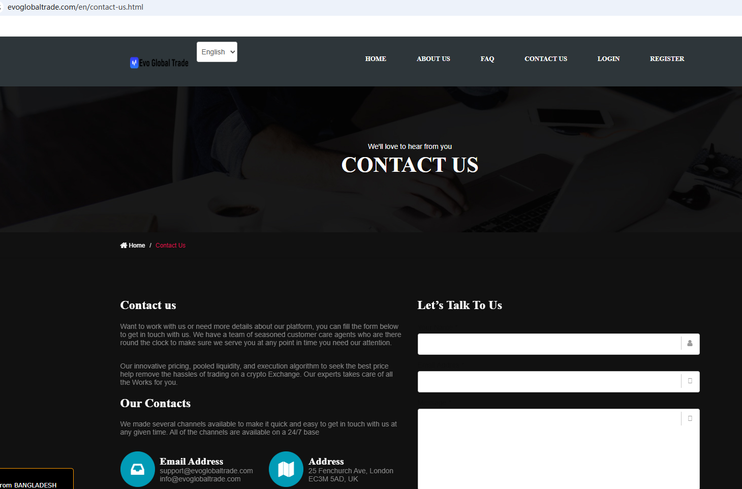 According to its website, it is located in the UK. Upon investigation, we found that the Financial Conduct Authority (FCA) issued a warning regarding EVO GLOBAL TRADE, suspecting that this company may be offering financial services or products without the necessary authorization.