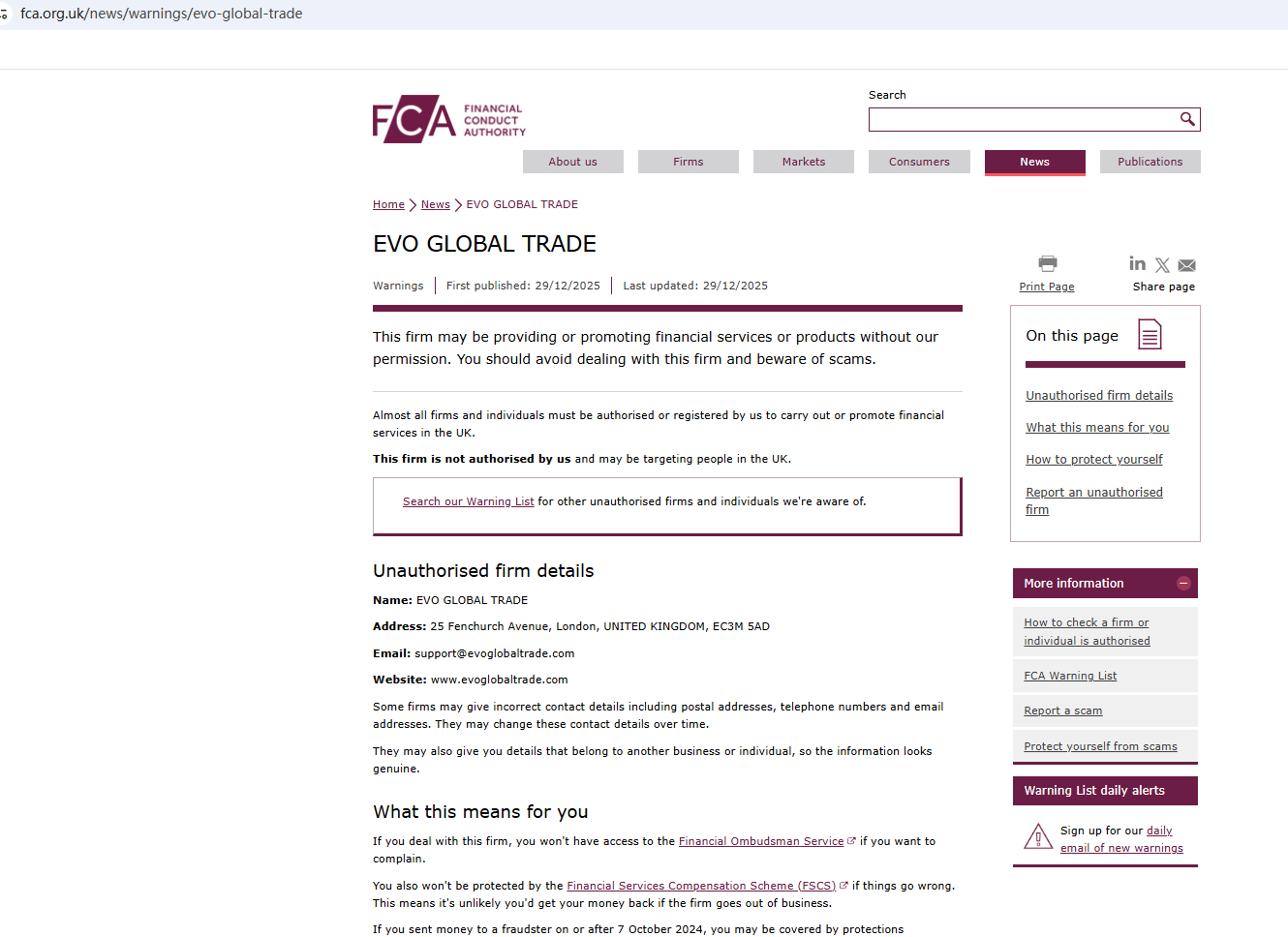 On Dec 29, 2025, the Financial Conduct Authority (FCA) issued a warning regarding EVO GLOBAL TRADE, suspecting that this company may be offering financial services or products without the necessary authorization. https://www.fca.org.uk/news/warnings/evo-global-trade