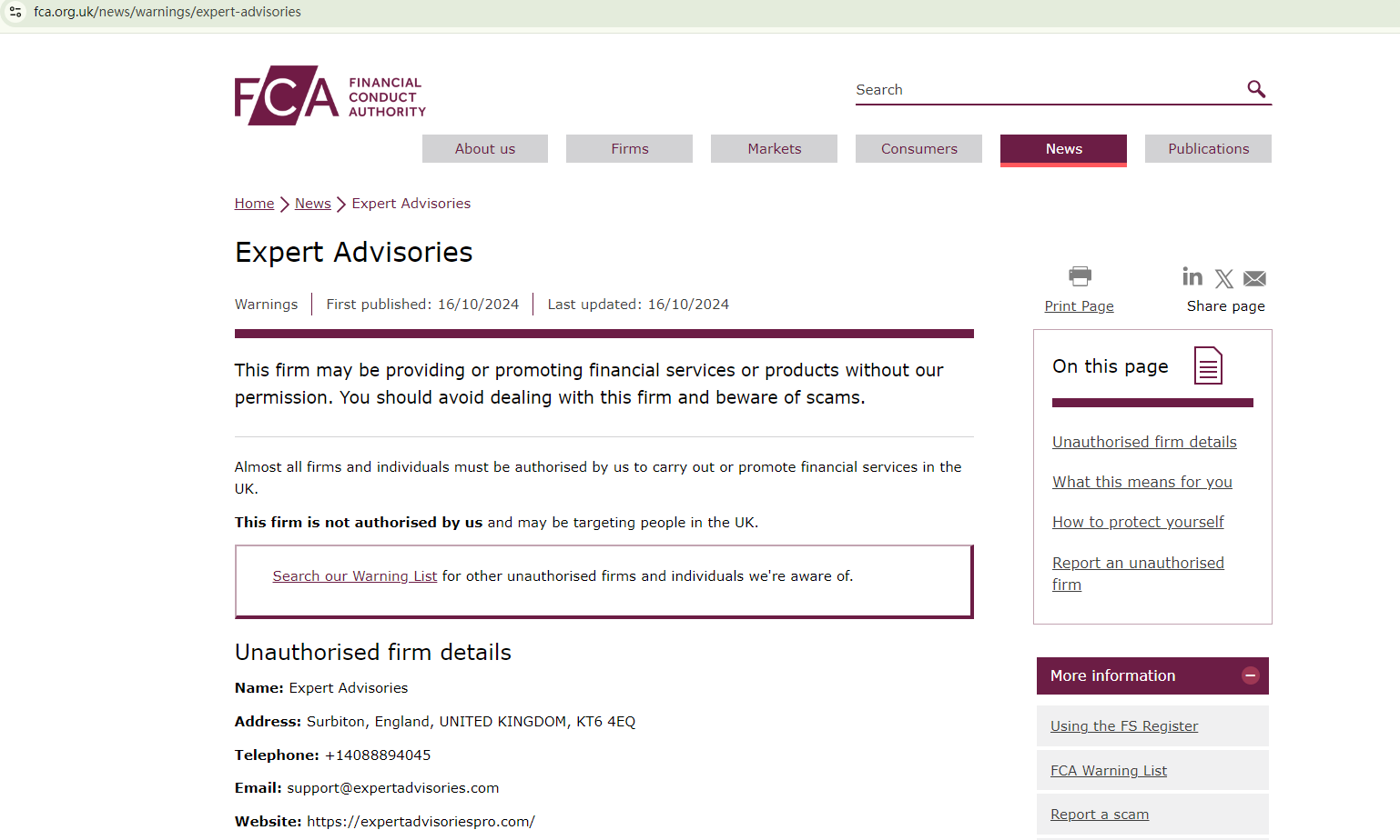 The trading platform, Expert Advisories, uses a flashy name—a common trait among fraudulent sites. The website, registered in January 2024, is relatively new, which is another red flag. We found no valid company information or licensing details on the site, and the Financial Conduct Authority (FCA) has issued a warning against Expert Advisories for operating without the required authorization.In essence, Expert Advisories is not regulated by any governing body. Entrusting it with investors' funds is highly risky, as there are no legal protections in place to safeguard the funds.Expert Advisories appears to be a scam.