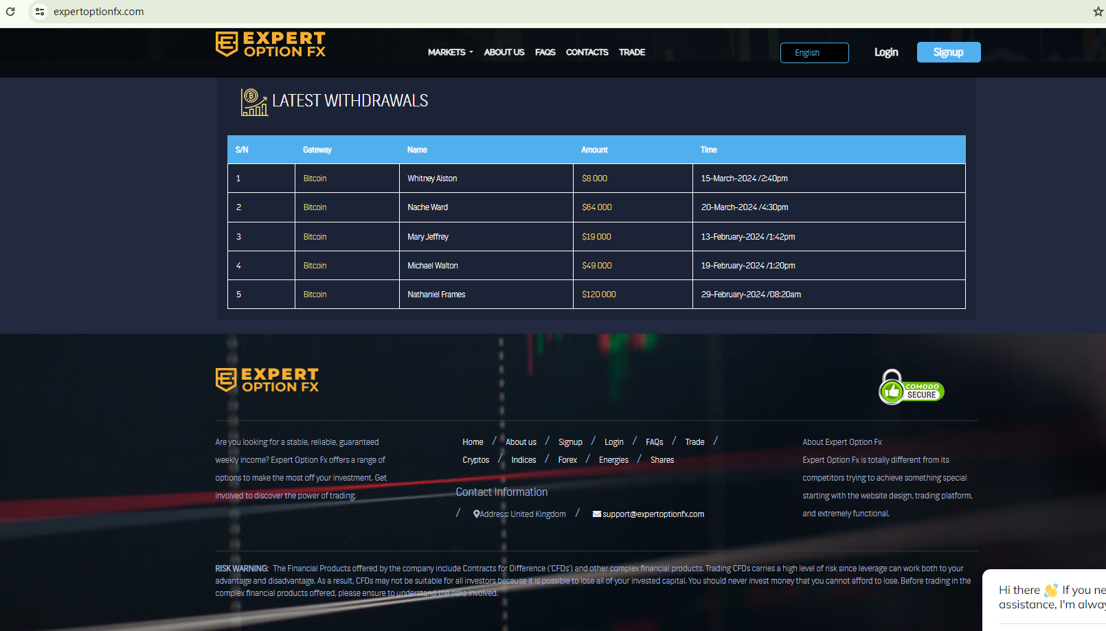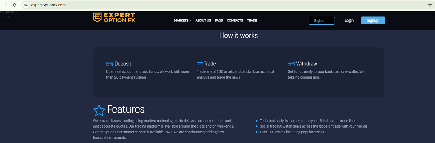 Expert Option Fx attempts to use exaggerated languages to build reputation, but fails to provide any regulatory details to substantiate its legitimacy. While it claims to be located in the UK, the Financial Conduct Authority (FCA), the country's financial watchdog, has issued a warning about it, identifying it as an unauthorized firm.