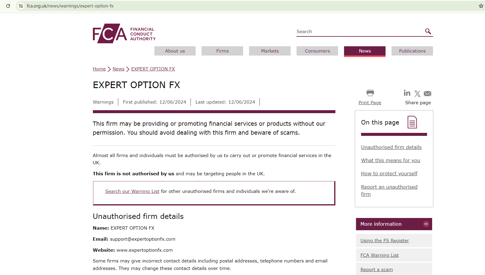 Expert Option Fx attempts to use exaggerated languages to build reputation, but fails to provide any regulatory details to substantiate its legitimacy. While it claims to be located in the UK, the Financial Conduct Authority (FCA), the country's financial watchdog, has issued a warning about it, identifying it as an unauthorized firm.In essence, Expert Option Fx is not regulated by any governing body. Entrusting it with investors' funds is highly risky, as there are no legal protections in place to safeguard the funds.Expert Option Fx appears to be a scam.
