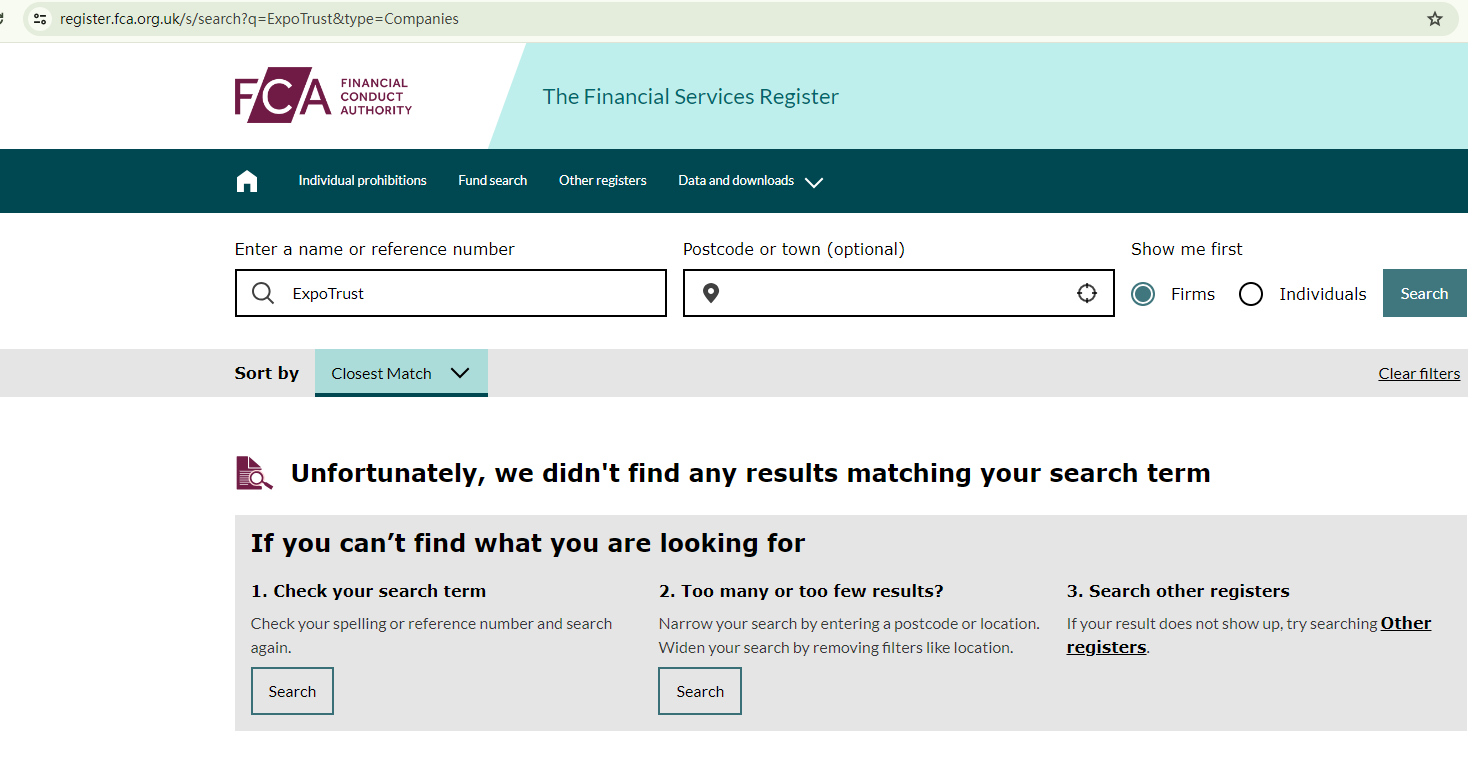 Expo Trust claims to be a trading platform regulated by the Financial Conduct Authority (FCA).However, our search for this company in the FCA register didn't yield any matching results. This allegedly UK-domiciled company doesn't comply with relevant regulations and gives false regulatory information to deceive unwitting investors.In summary, Expo Trust is not regulated by any governing body. It is highly risky to entrust them with investors' funds due to the absence of legal protections to safeguard these funds. Therefore, Expo Trust appears to be fraudulent.