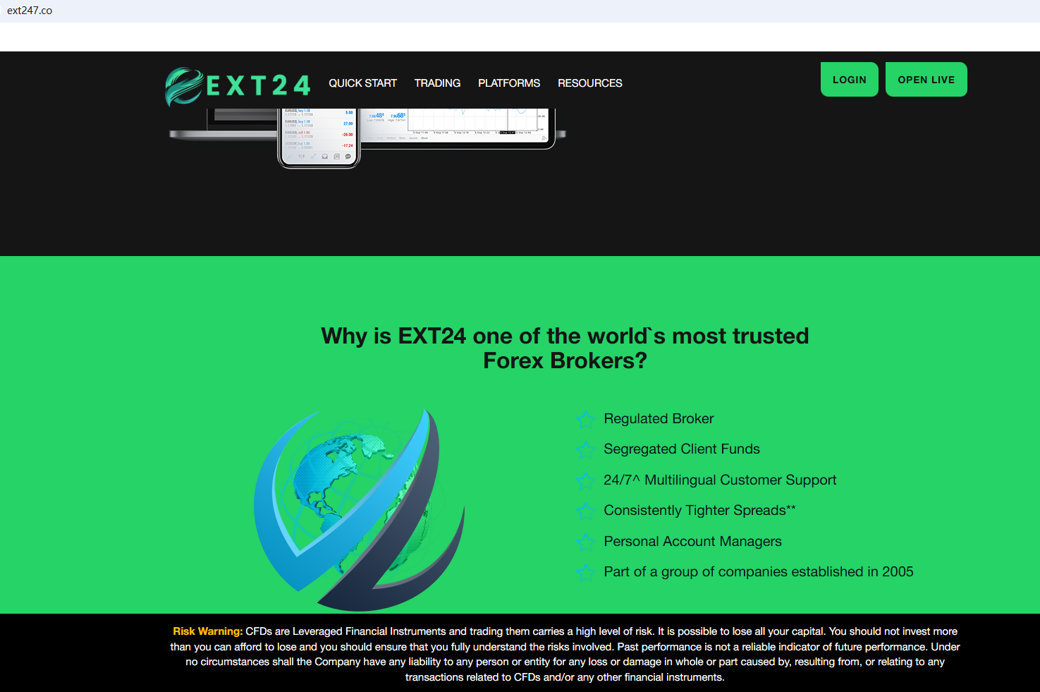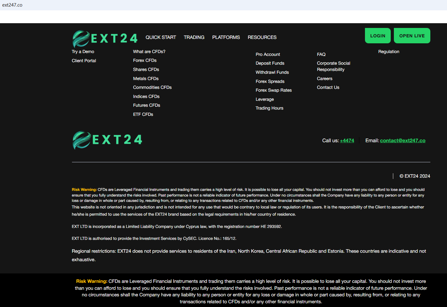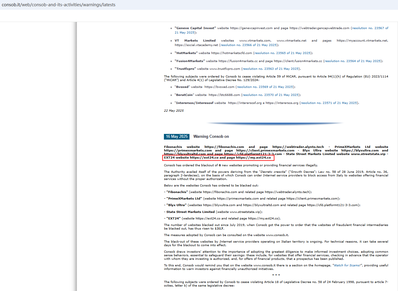 On May 16, 2025, the Italian Companies and Exchange Commission (CONSOB) has ordered EXT24's website to be blacked out since it offers financial services illegally. https://www.consob.it/web/consob-and-its-activities/warnings/latests