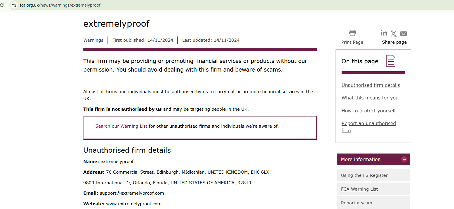Extremelyproof appears to have just emerged, with its domain name newly registered in mid-September 2024. The use of a website template to establish its online presence aligns with its recent domain registration, suggesting an intention to solicit investors quickly. The company provides a bogus registration certificate from Companies House (CH) to substantiate its claim of being registered. Additionally, the Financial Conduct Authority (FCA) has issued a warning against Extremelyproof for lacking the required authorization.In essence, Extremelyproof is not regulated by any governing body. Entrusting it with investors' funds is highly risky, as there are no legal protections in place to safeguard the funds.Extremelyproof appears to be a scam.