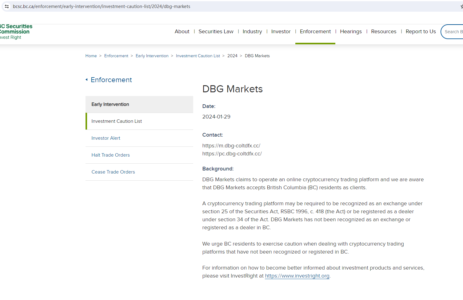 On 29 January 2024, the British Columbia Securities Commission (BCSC) issued a warning that Fake DBG Markets was providing financial services or products without authorisation. You may visit: https://www.bcsc.bc.ca/enforcement/early-intervention/investment-caution-list/2024/dbg-markets