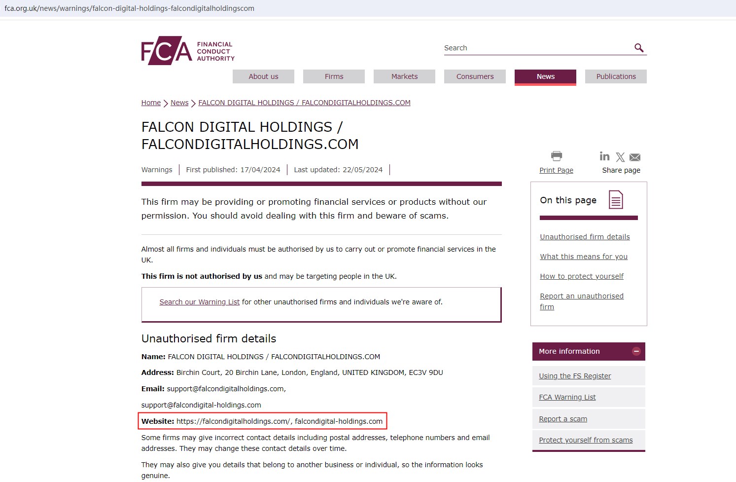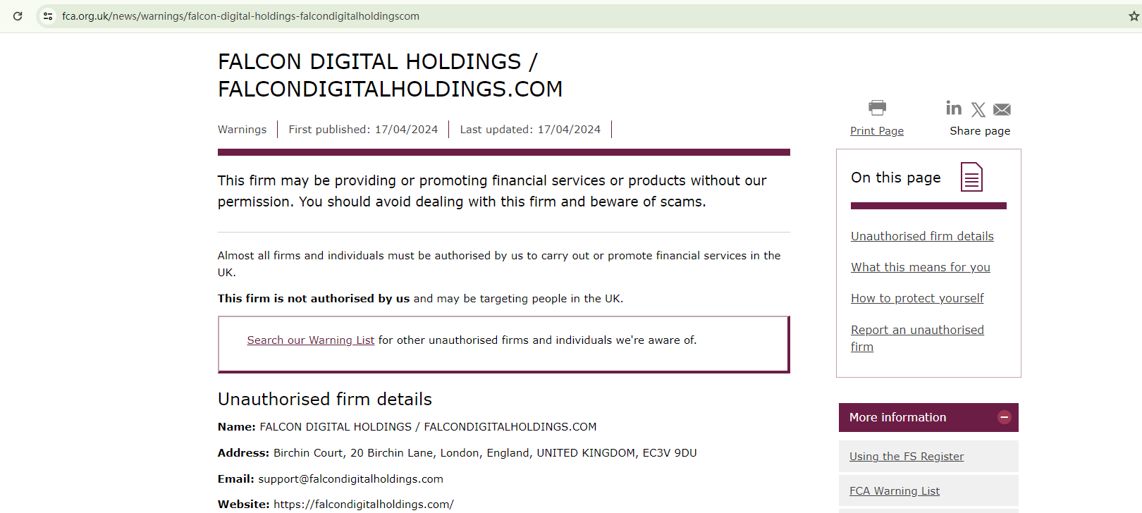 What's more, despite asserting its location in the UK, FALCON DIGITAL HOLDINGS has failed to secure the necessary authorization from the Financial Conduct Authority (FCA), resulting in a warning issued by the FCA.