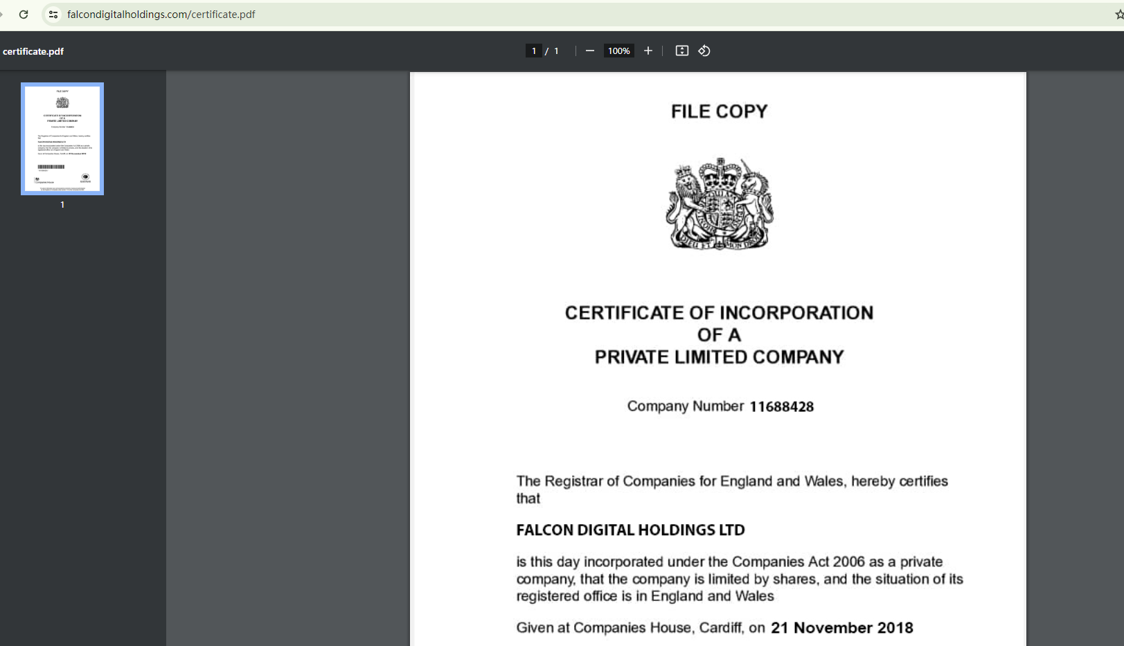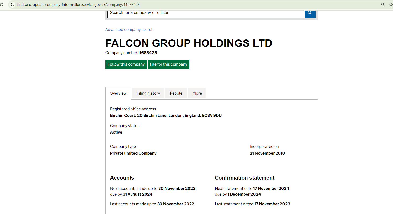 FALCON DIGITAL HOLDINGS claims to be registered with the Companies House (CH) under the registration number 11688428. However, the CH register shows that the company associated with this number is FALCON GROUP HOLDINGS LTD, which is involved in management consultancy activities unrelated to financial management. The discrepancies in the company names and their business scopes raise doubts about the authenticity of the claim. It's possible that FALCON DIGITAL HOLDINGS is misusing the information of a registered entity to project an image of authenticity.